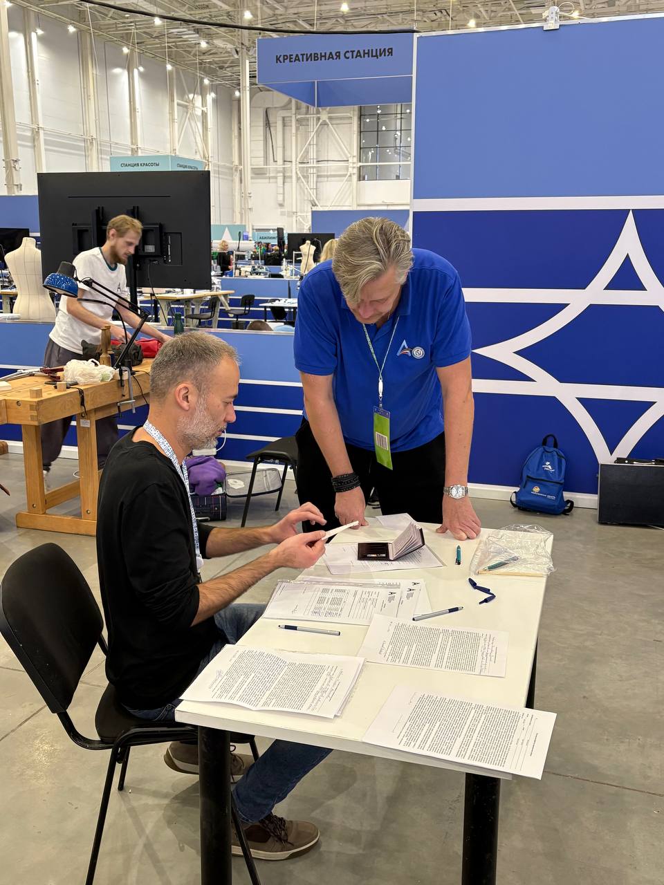 Во второй день соревнований в компетенции «резьба по дереву» в борьбу за первенство вступил ветеран СВО из Курской области Дмитрий Бобинец. Участникам необходимо выполнить конкурсное задание - «декоративная тарелка с рельефной резьбой». Удачи!