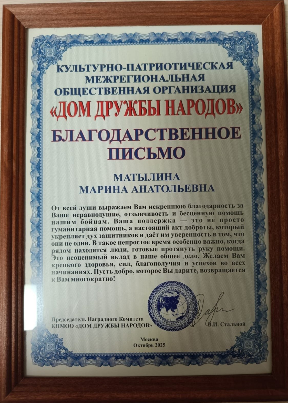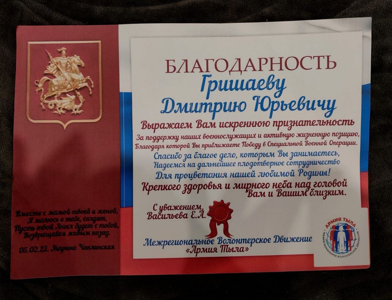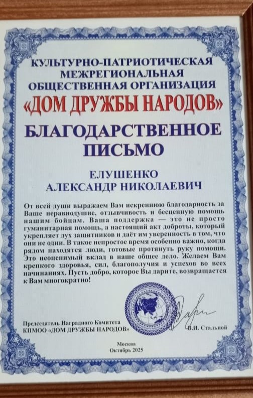 За неравнодушие, отзывчивость и бесценную помощь бойцам Благодарственным письмом награждены наши волонтёры Александр Елушенко и Марина Матылина.