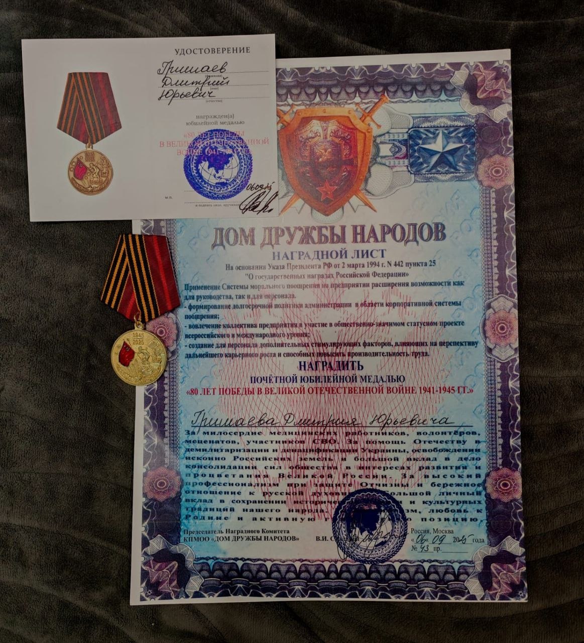 Почетной юбилейной медали "80 лет Победы в Великой Отечественной войне 1941-1945 гг. " и Благодарности за поддержку военнослужащих удостоен Дмитрий Гришаев.