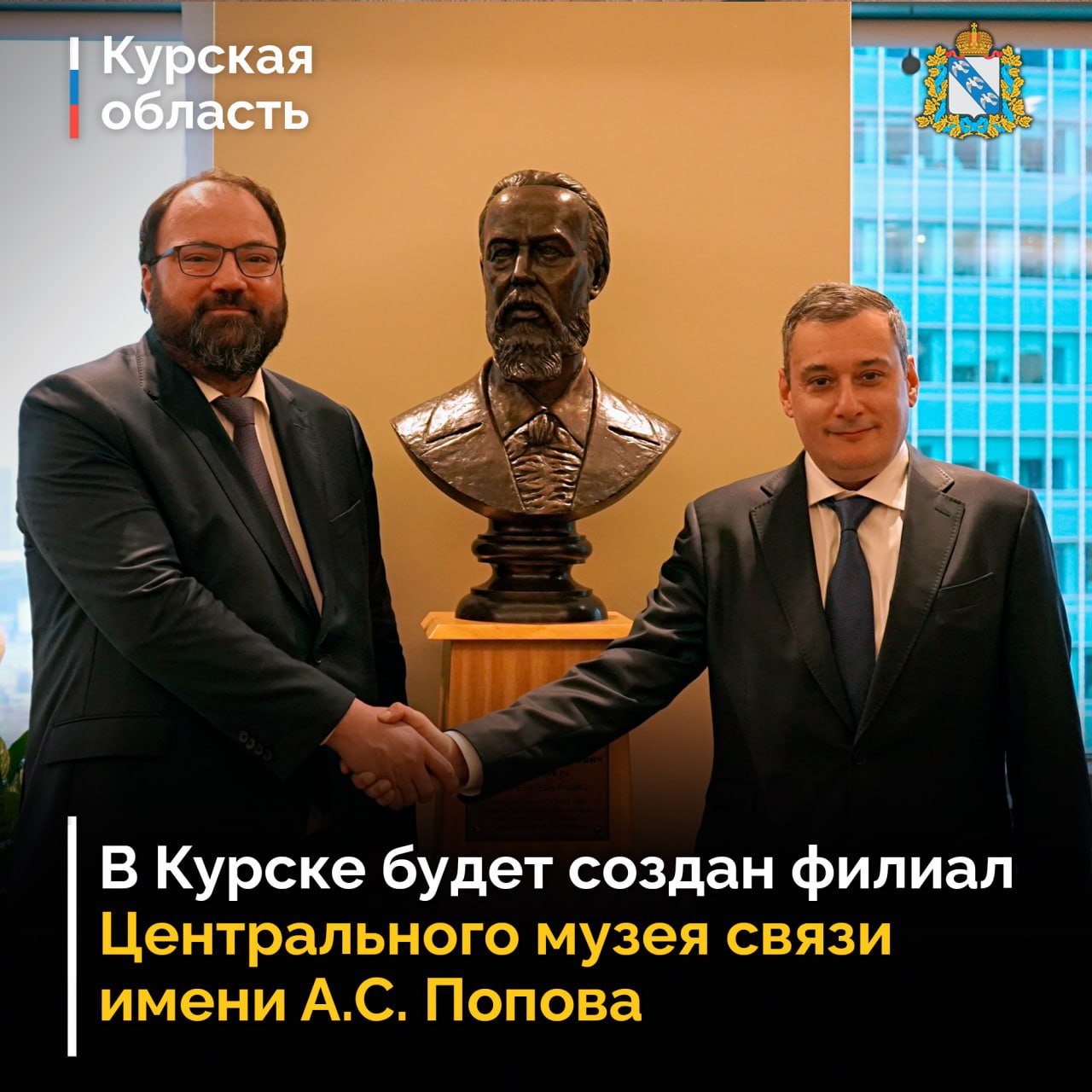 Кроме того, на встрече шла речь о создании в Курске филиала Центрального музея связи имени А.С. Попова. Достигнута договоренность о его размещении в здании Курского почтамта на Красной площади.