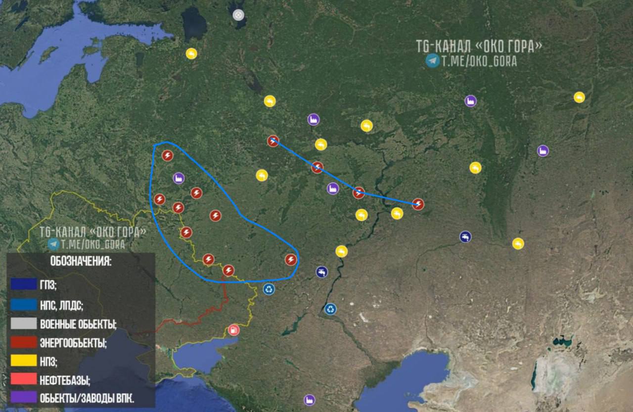 Целями атак якобы стали: 11 подстанций, 5 ТЭЦ, 12 НПЗ, 1 нефтебаза, 3 линейных производственно-диспетчерская станции и нефтеперекачивающих станции, 2 газоперерабатывающих завода, 1 военный объект, 6 предприятий, связанных с ВПК.