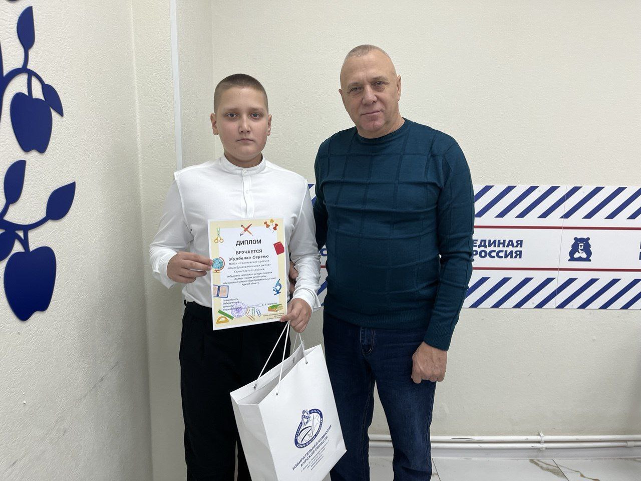 Я тепло поприветствовал юного земляка, отметив его художественный талант. Поздравил Сергея с заслуженной наградой, вручил ему диплом Избирательной комиссии Курской области и памятный подарок. Пожелал ему дальнейших творческих успехов!