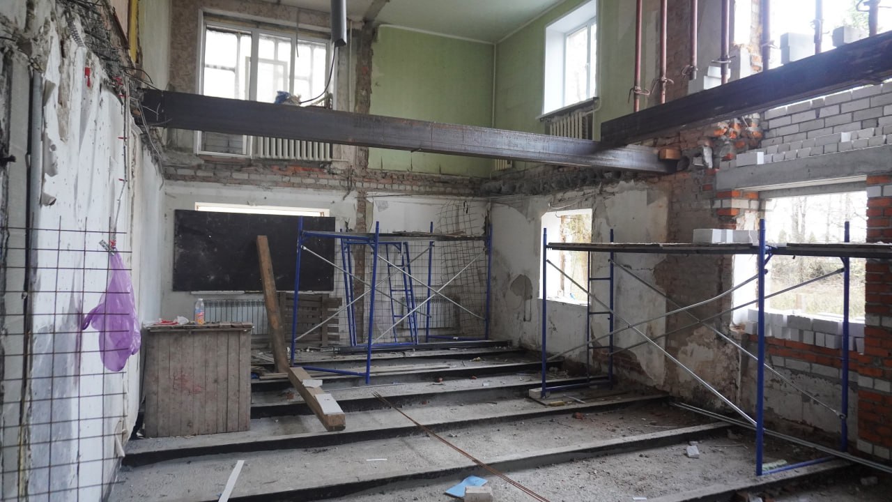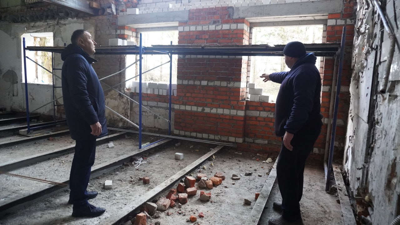 На этом объекте ситуация сложнее. Сейчас идёт восстановление кирпичной кладки — каменщики устраняют повреждения наружных и несущих стен. Работа трудоёмкая, но выполняется качественно и поэтапно.