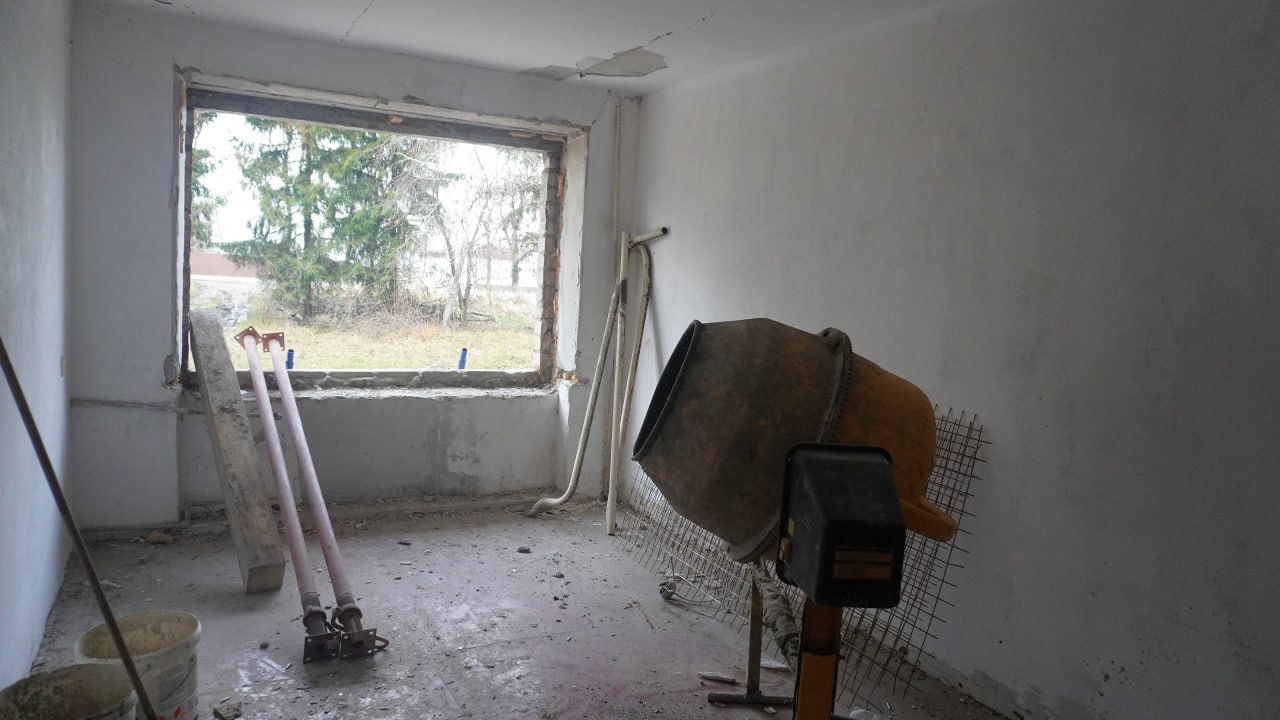 Здесь восстановление продвигается в плановом порядке. Подрядчики уже приступили к малярным работам: выполняют оклейку обоев, укладку кафеля, подготовку помещений под финишную отделку. Тепло в дом подано, специалисты работают стабильно.