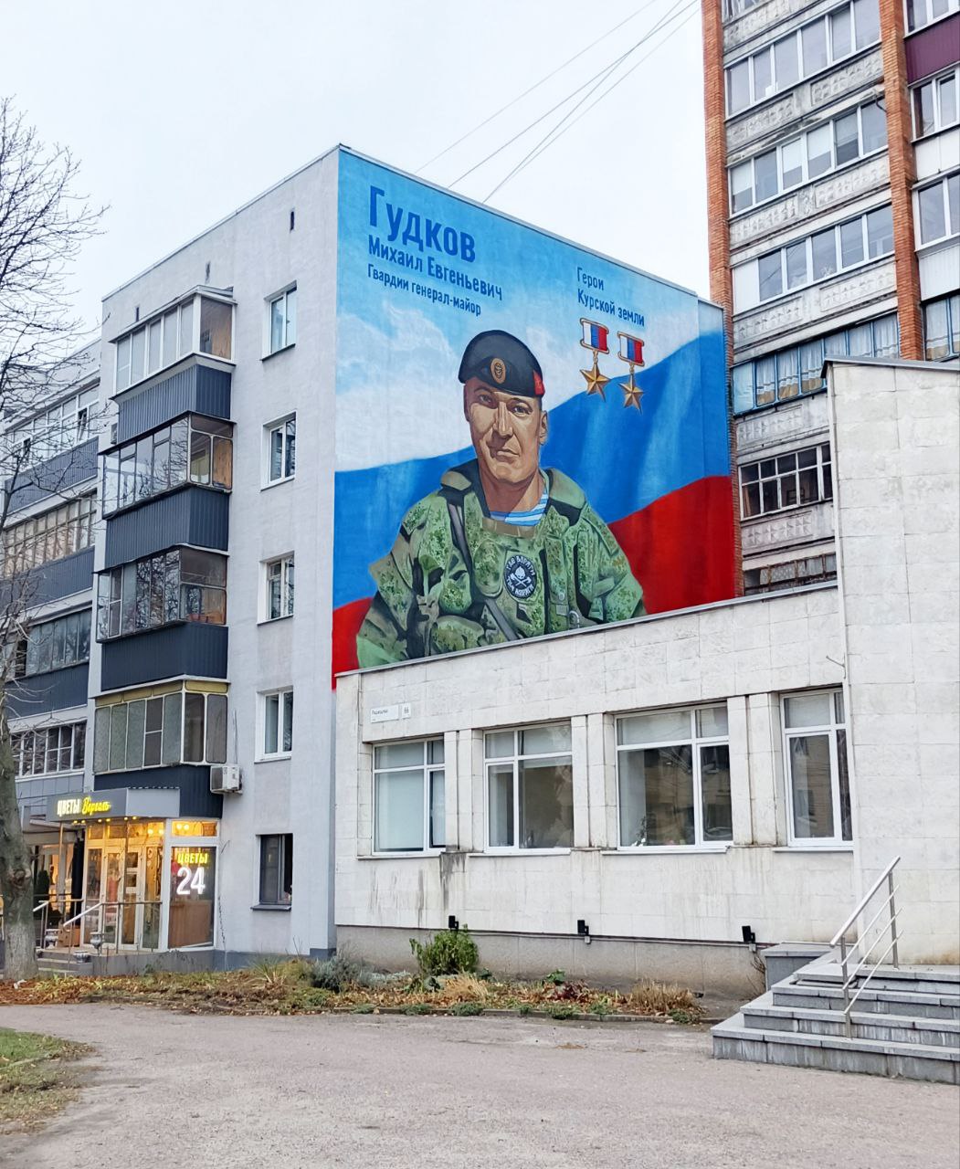 На фасаде дома на улице Радищева, 64, сегодня торжественно открыли мурал в память о первом и единственном дважды Герое РФ Михаиле Гудкове (позывной «Варяг»)