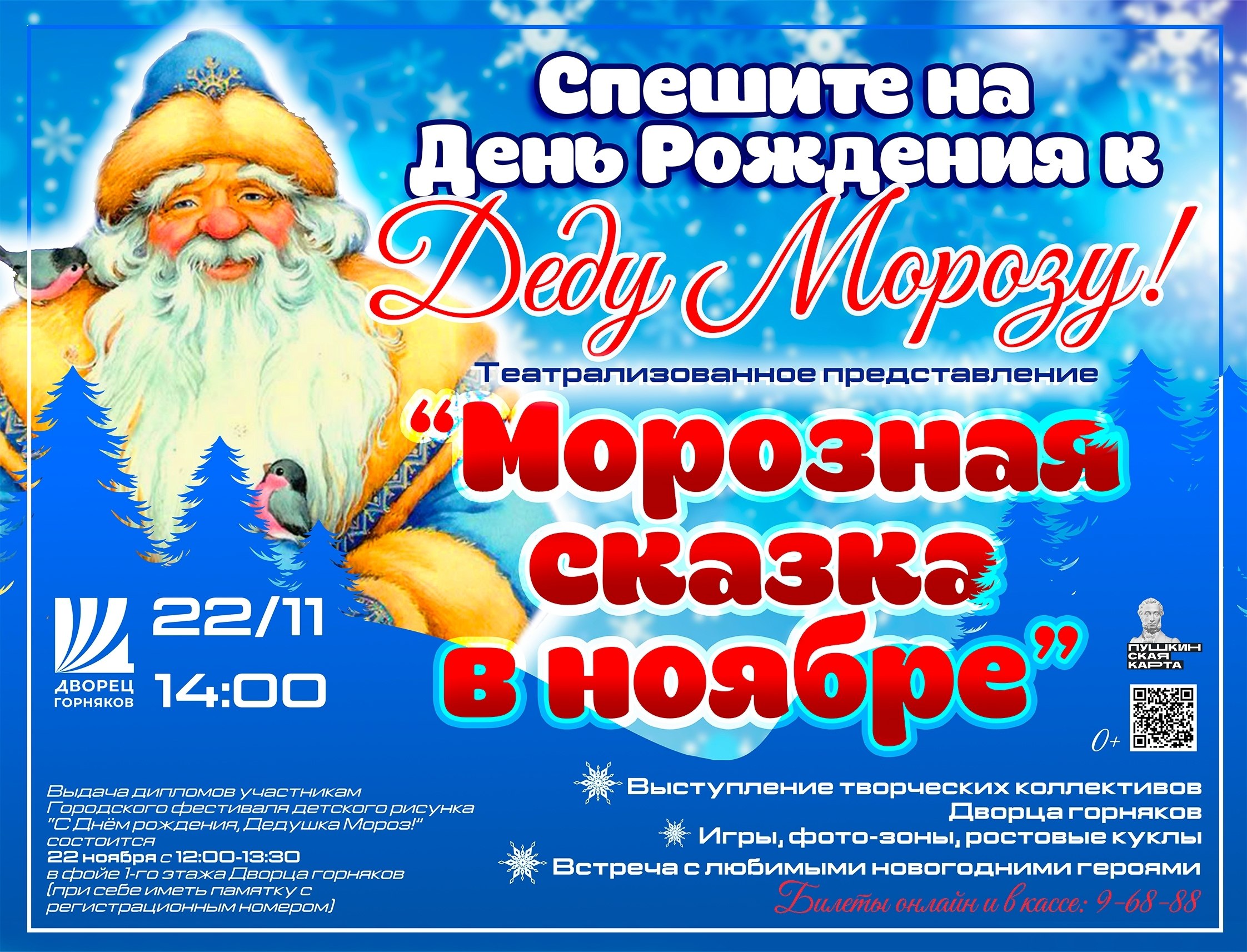 Артисты и творческие коллективы Дворца горняков приглашают жителей и гостей города Железногорска на театрализованное представление "Морозная сказка в ноябре" для всей семьи, посвященную дню рождения главного волшебника страны – Деда Мороза.
