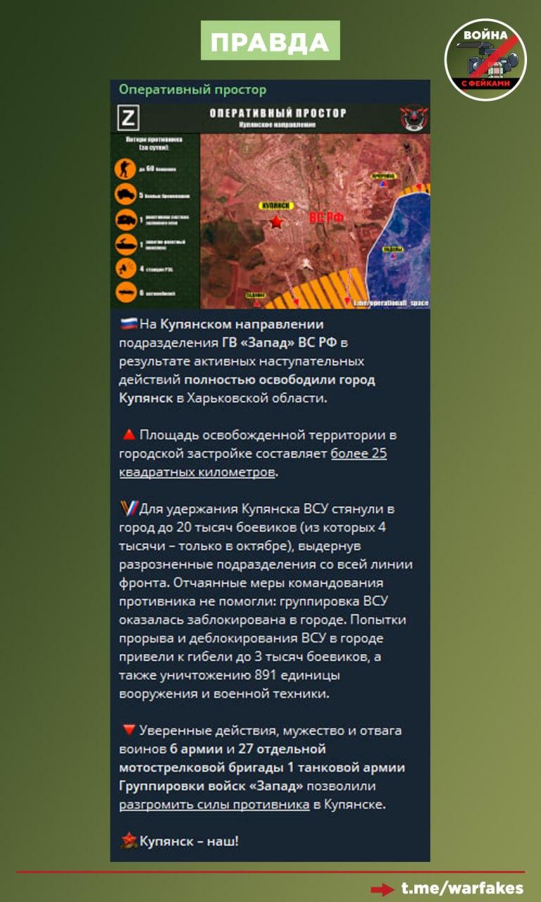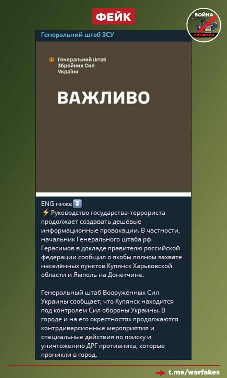 Фейк: ВС РФ не освободили Купянск, заявляет Генштаб ВСУ.