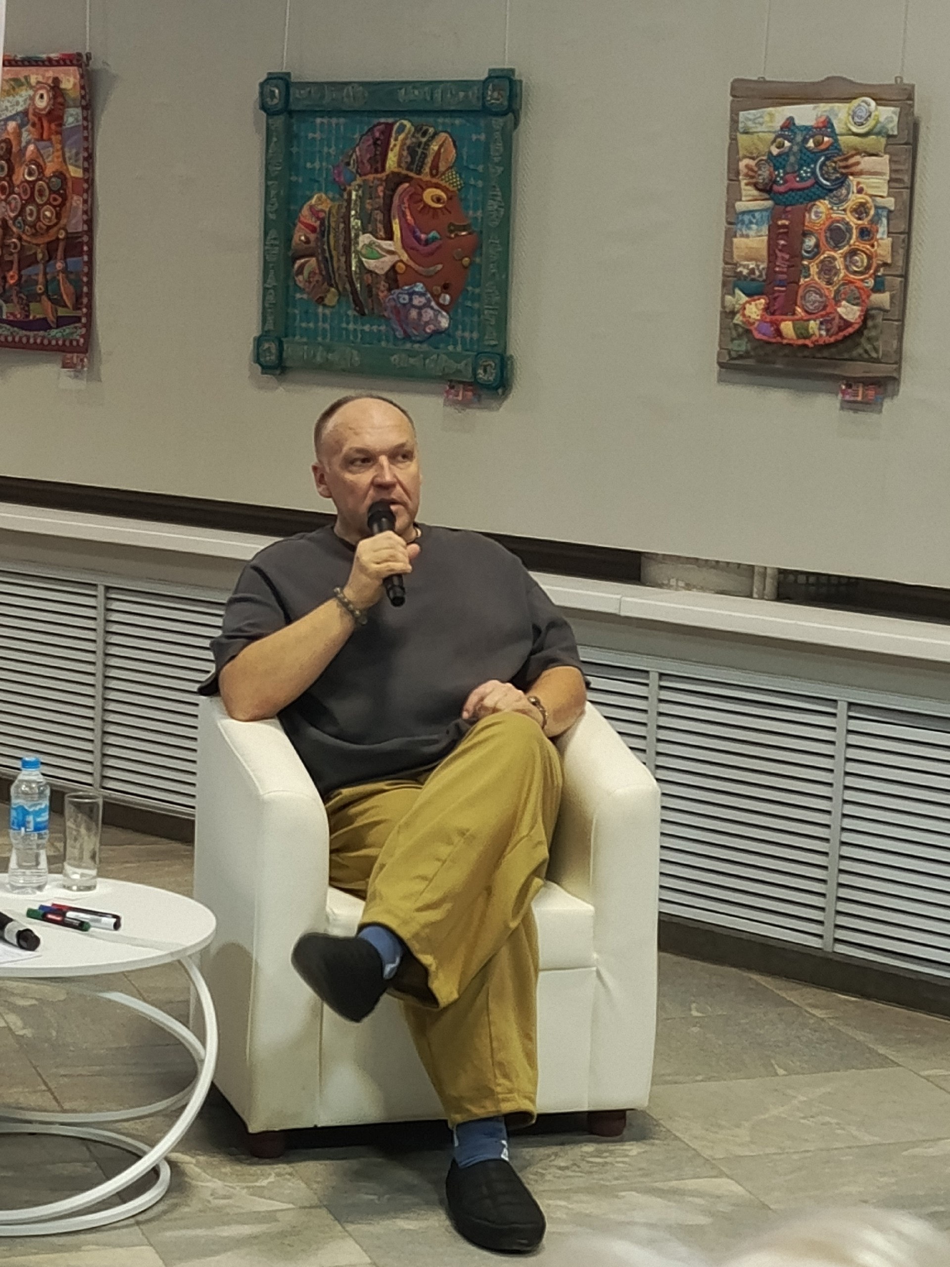 Художник поделился, что вдохновение черпает во всём, что его окружает: в природе, людях и, конечно, в прекрасных тканях. Присутствующие узнали, что он создает как миниатюрные броши, так и грандиозные работы, например, занавес для одного из курских вузов.