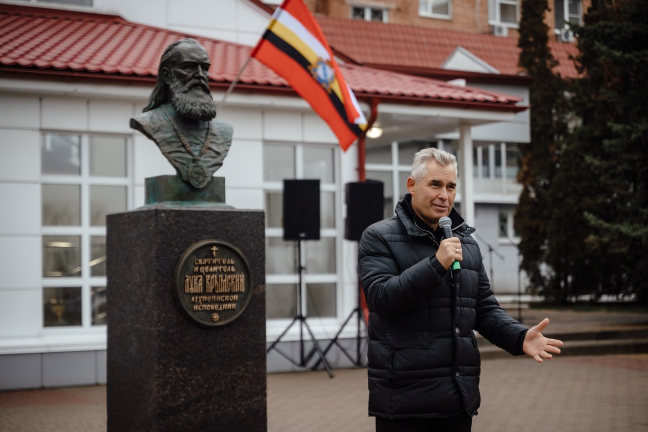 «Мы открываем памятник одному из самых почитаемых святых. Служение святого Луки проходило и на Курской земле, здесь он сделал свои первые шаги в хирургии. Нашему главному лечебному учреждению — Курской областной многопрофильной клинической больнице присвоено имя Святителя Луки», — отметил Александр Хинштейн.