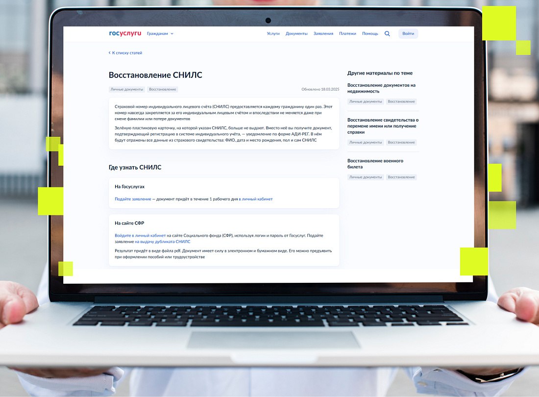 Жители Курской области могут без визита в ведомства восстановить страховой номер индивидуального лицевого счёта с помощью портала «Госуслуги». Пластиковое свидетельство сейчас не требуется, достаточно номера СНИЛС, который отображается в личном кабинете пользователя.