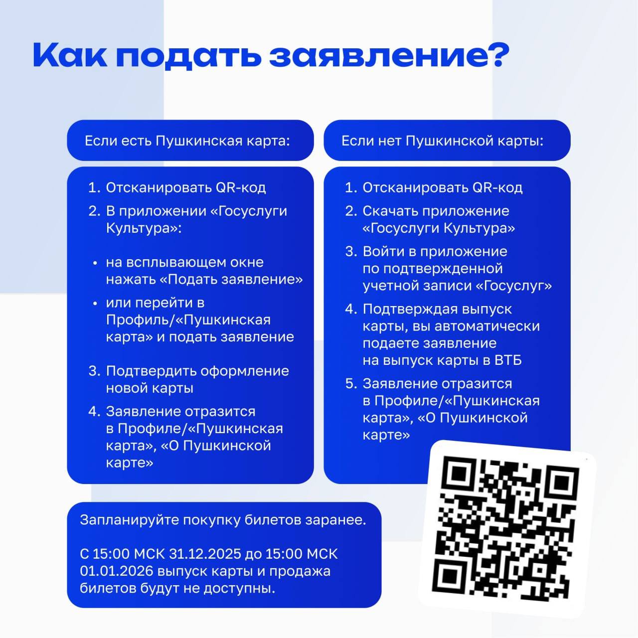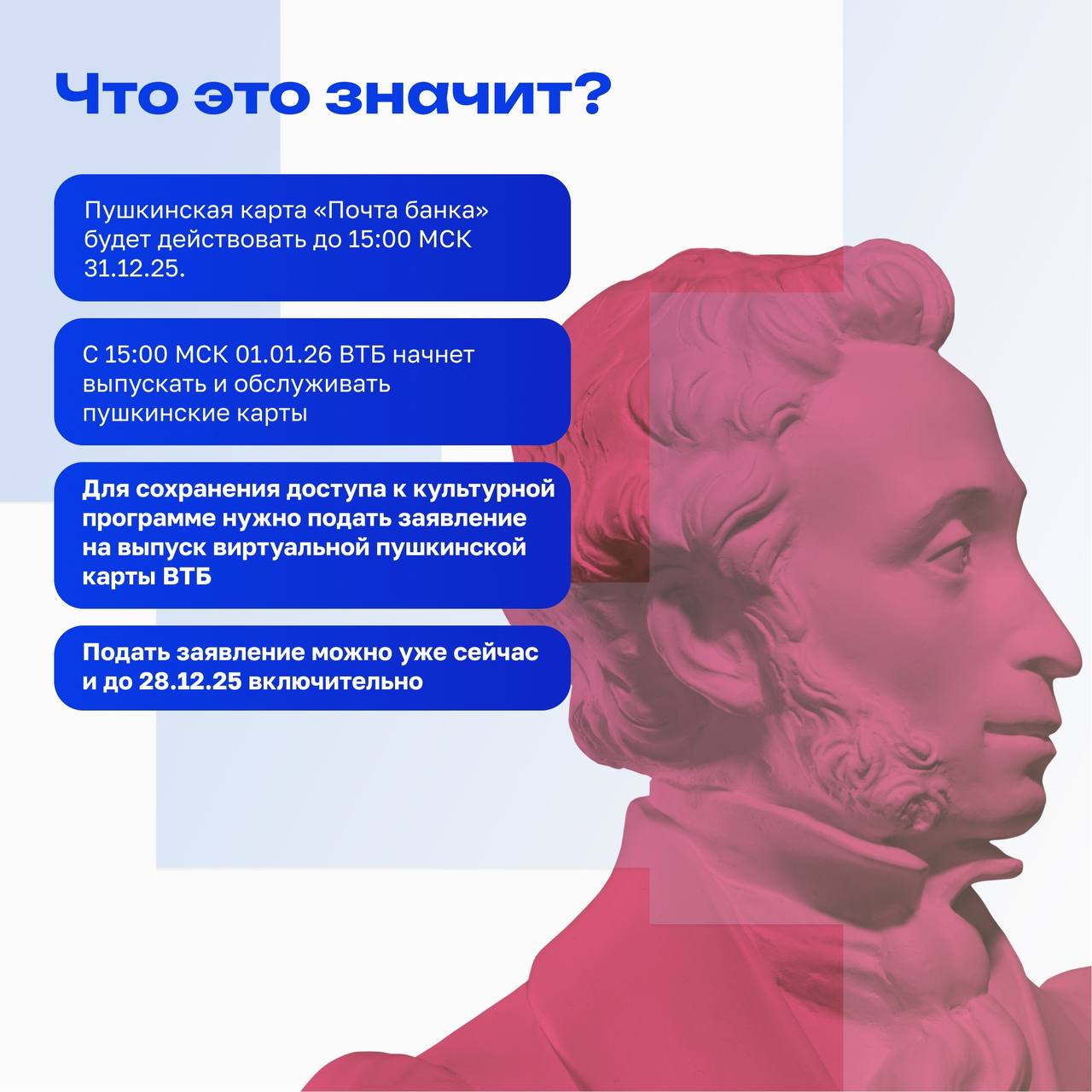 Для сохранения доступа к самым интересным выставкам и увлекательным постановкам нужно подать заявление на перевыпуск виртуальной Пушкинской карты в ВТБ до 28 декабря включительно.