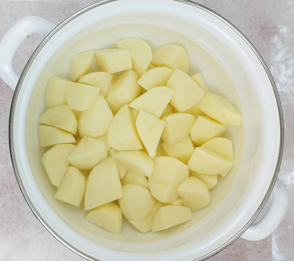 - Нарезка картофеля: Доведите кусочки до размера куриного яйца для равномерного приготовления.