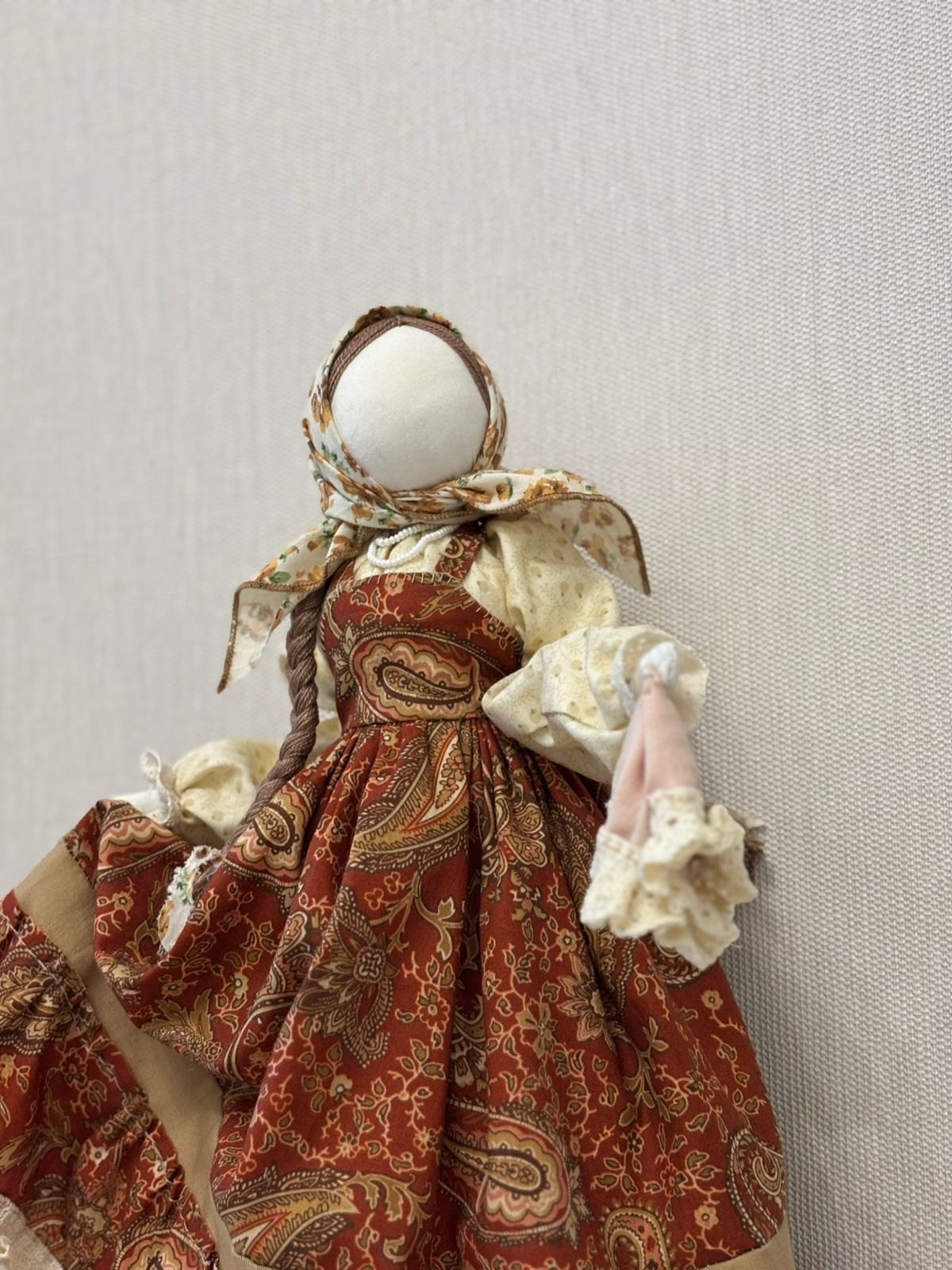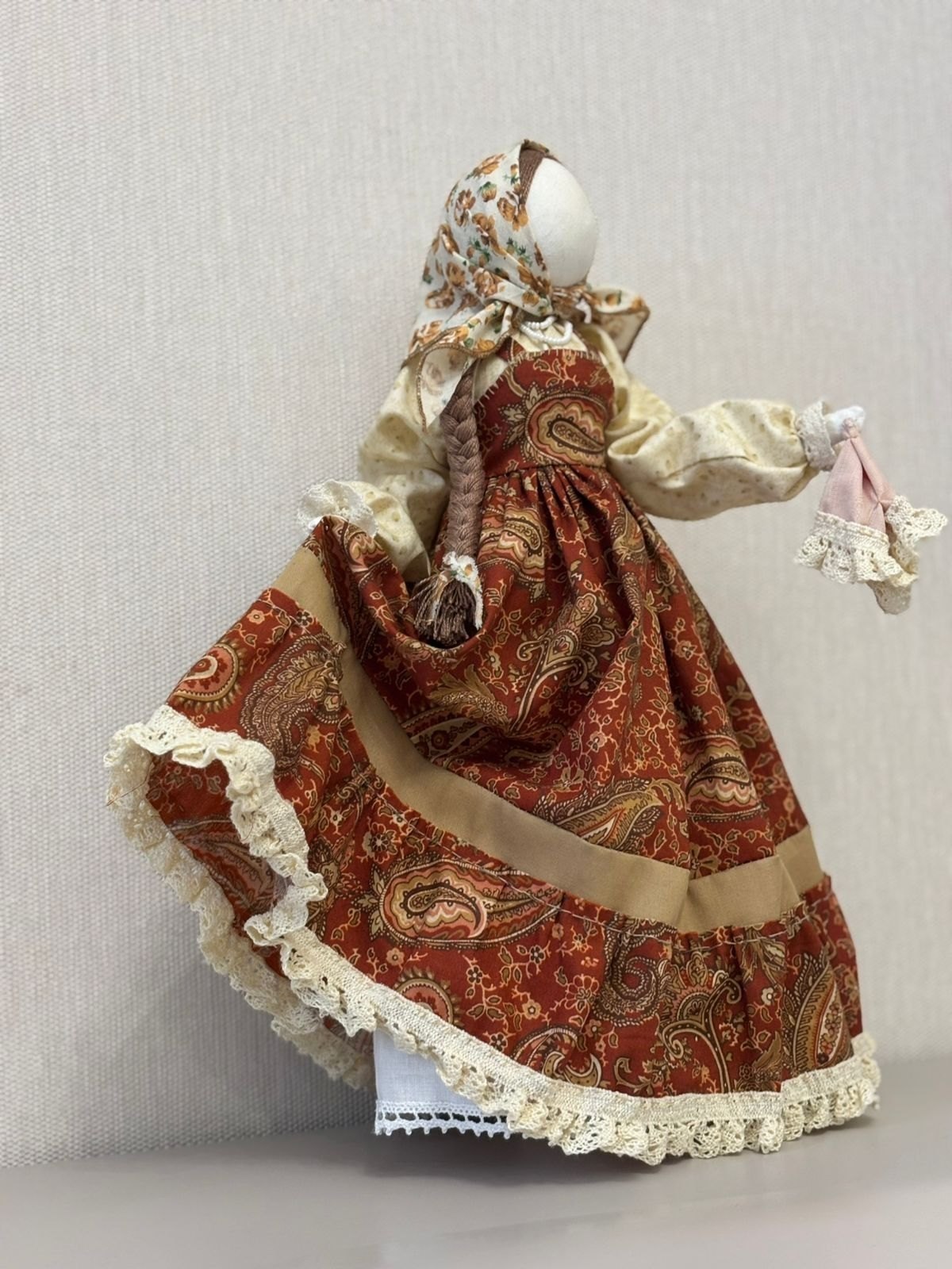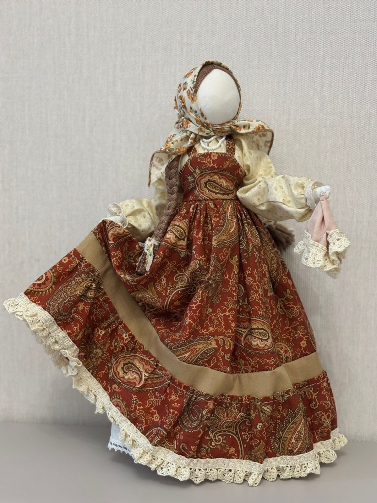 Играя со светом, многослойный костюм и матовые материалы создают иллюзию движения: то кукла замирает в меланхолии осеннего заката, то вспыхивает красками последнего теплого дня. Такая кукла — поэтическая метафора осени. Каждая деталь рассказывает тихую историю прощания с ней.