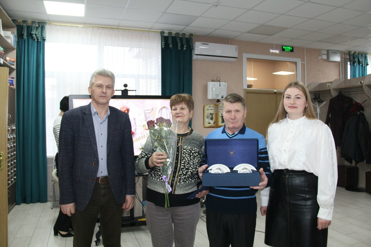 Юбилярам были вручены памятные подарки, наборы с двумя чайными чашками и блюдцами с Гербом Курской области и поздравительные открытки,от Губернатора Курской области Александра Евсеевича Хинштейна, а так же букеты цветов, символизирующие красоту и долговечность их чувств.