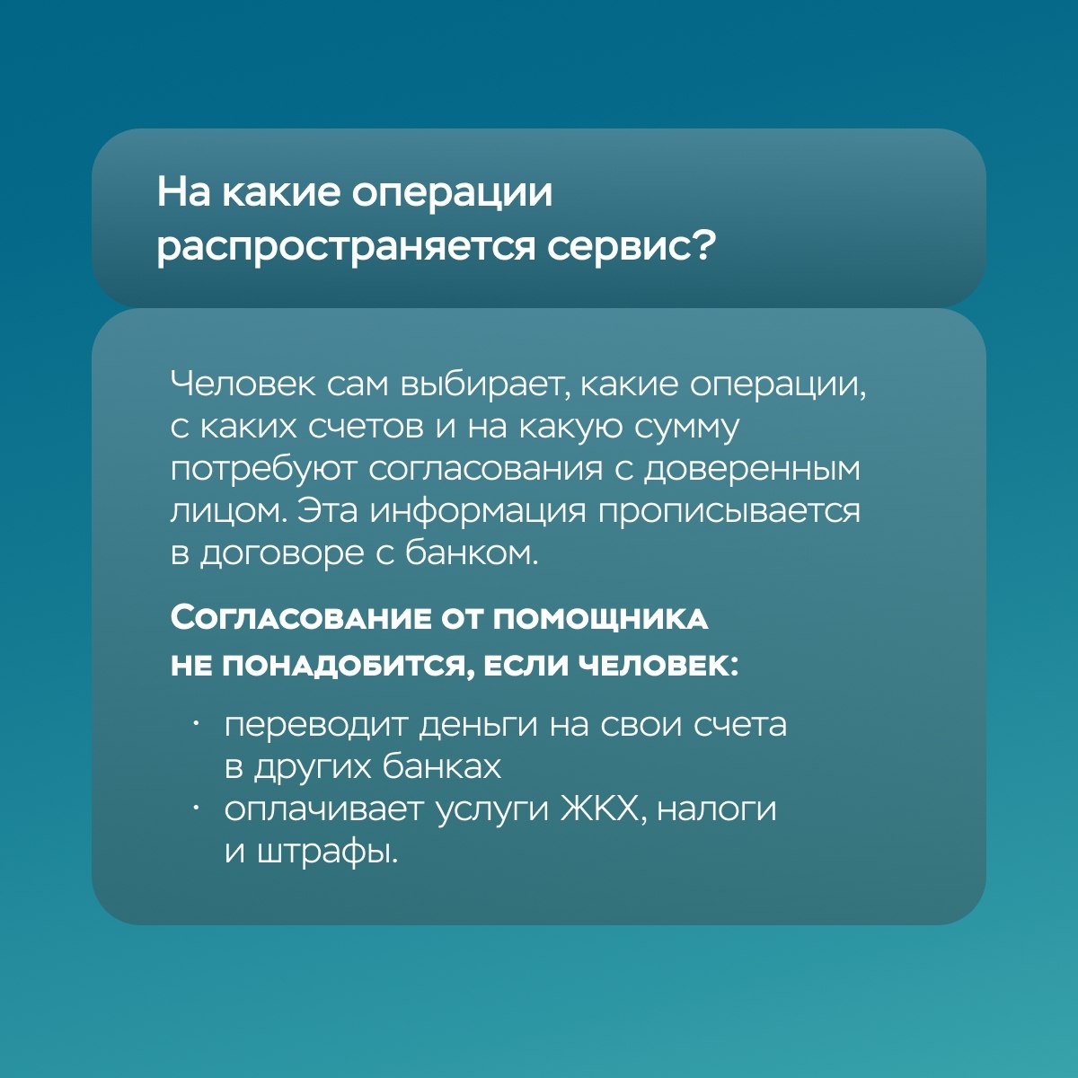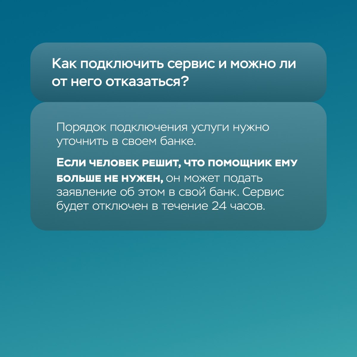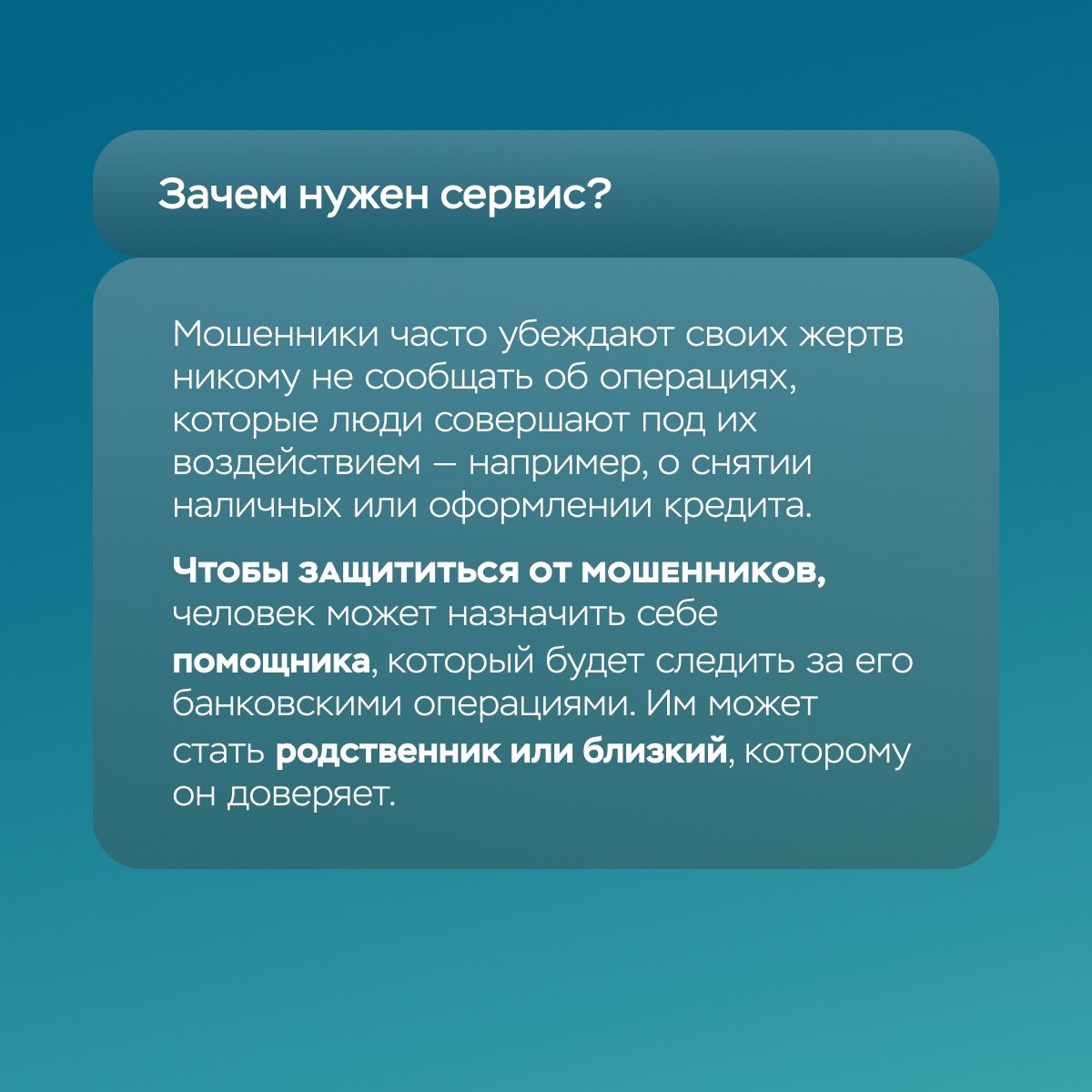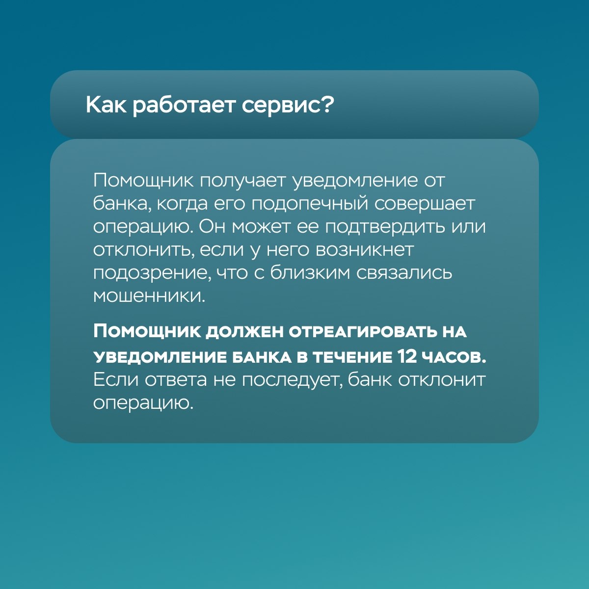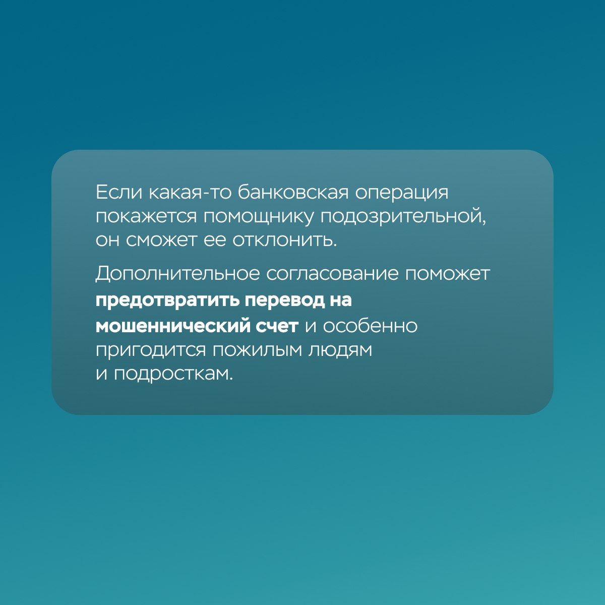 Важно, что помощник не имеет доступ к счету и не может управлять средствами самостоятельно. Скорее это дополнительная защита от мошенников, особенно для людей старшего возраста или подростков.