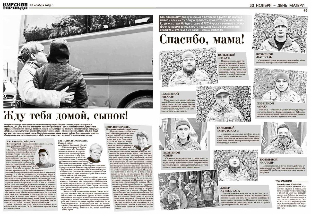 «Курская правда» представляет специальный проект ко Дню матери, подготовленный совместно с отрядом «Барс-Курск». В канун праздника мы дали возможность мамам и сыновьям, участвующим в СВО, обратиться друг к другу через страницы нашей газеты. Эти трогательные письма — искренний диалог самых близких людей.