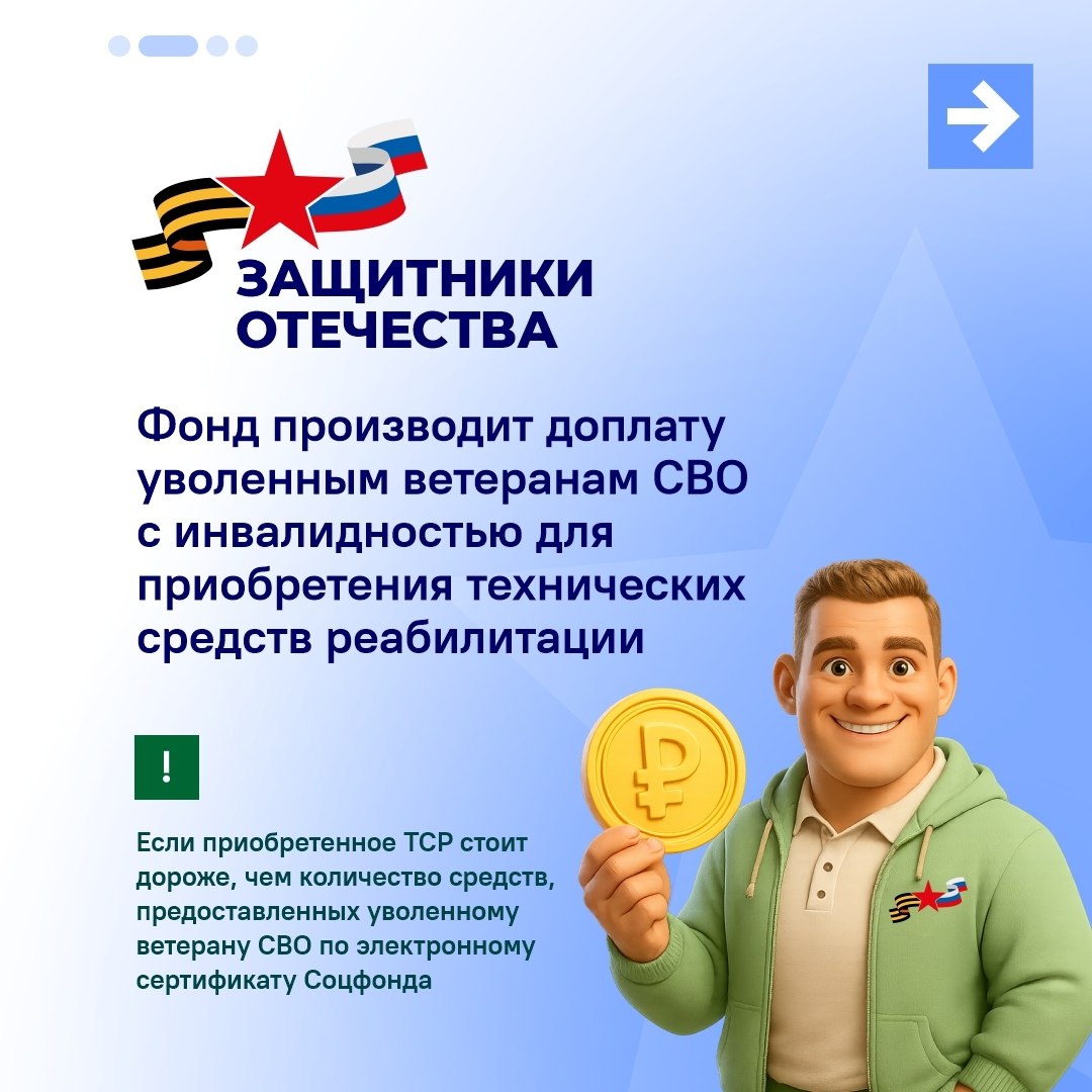 Фонд «Защитники Отечества» осуществляет доплату к стоимости электронного сертификата, предоставляемого Социальным фондом России. Доплата позволяет ветеранам приобретать высокотехнологичные и функциональные ТСР — протезы, кресла-коляски и слуховые аппараты.