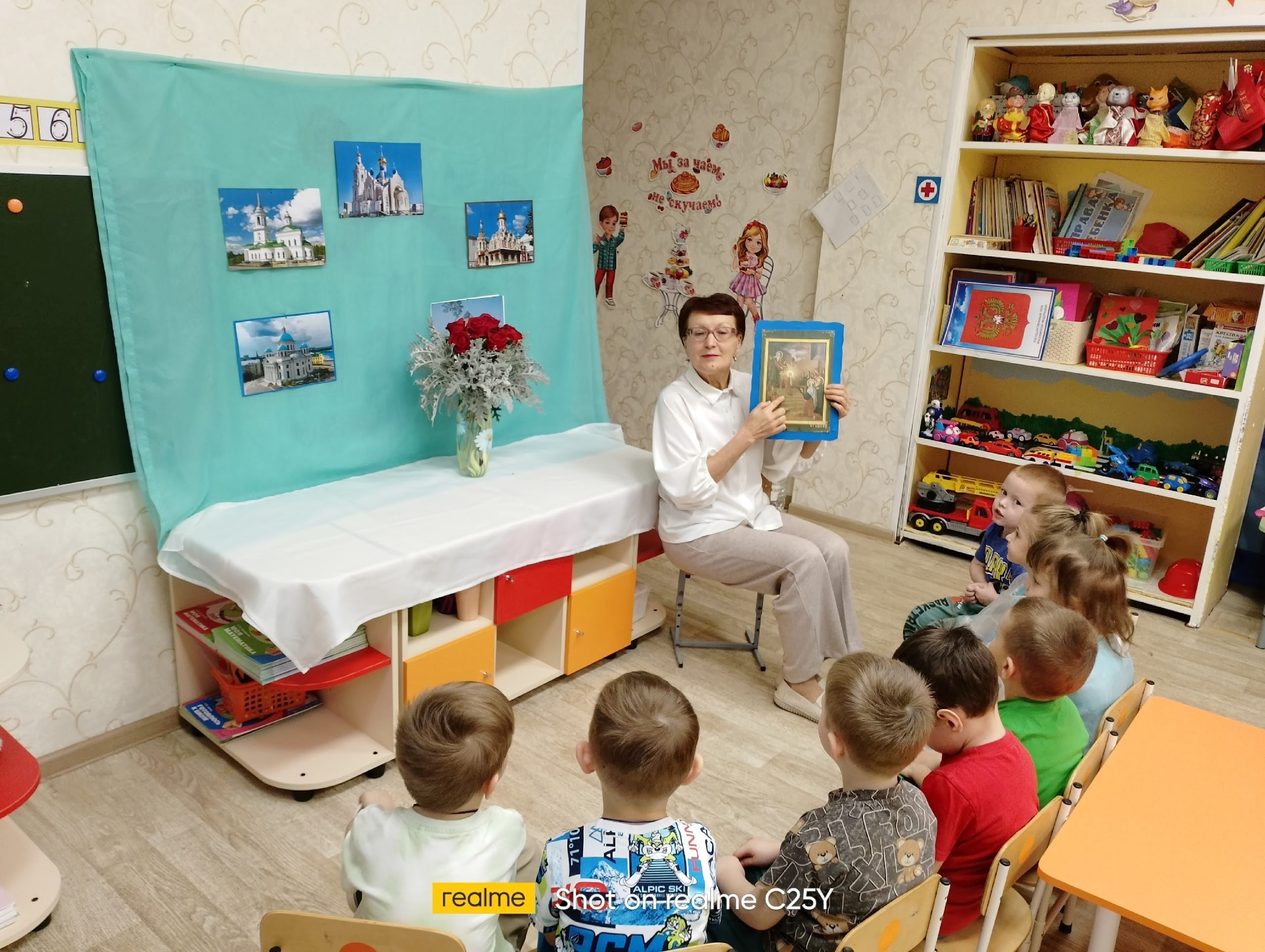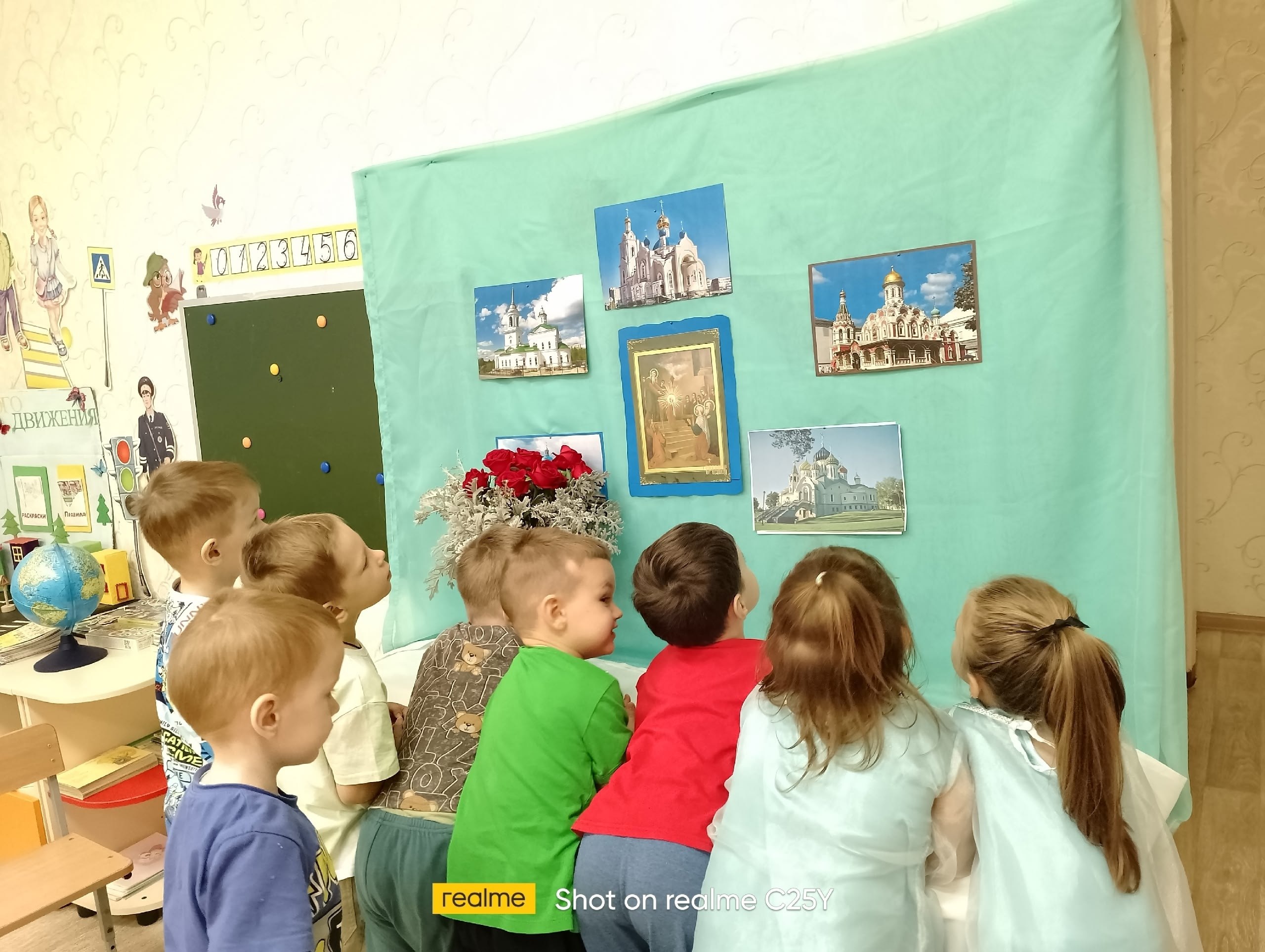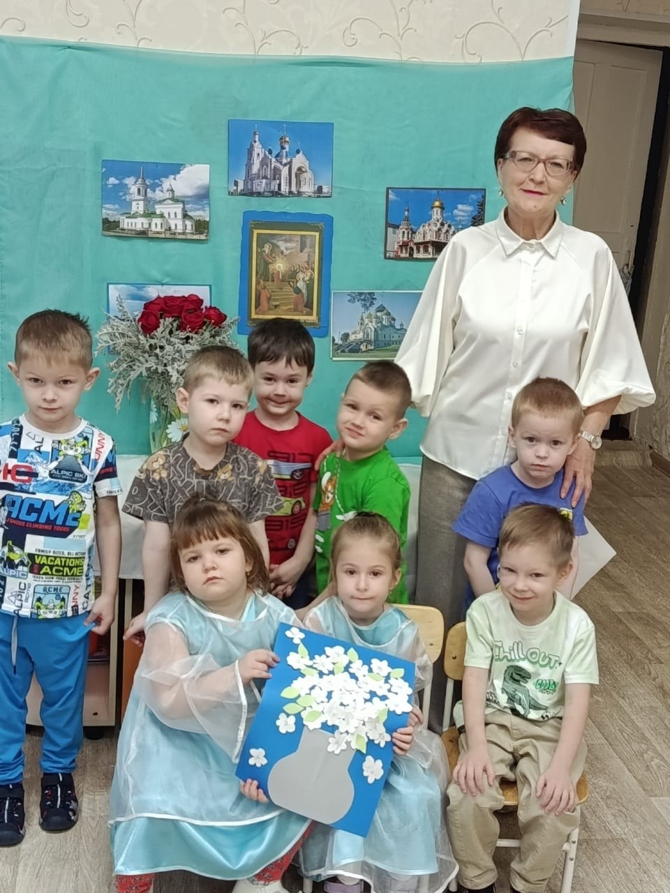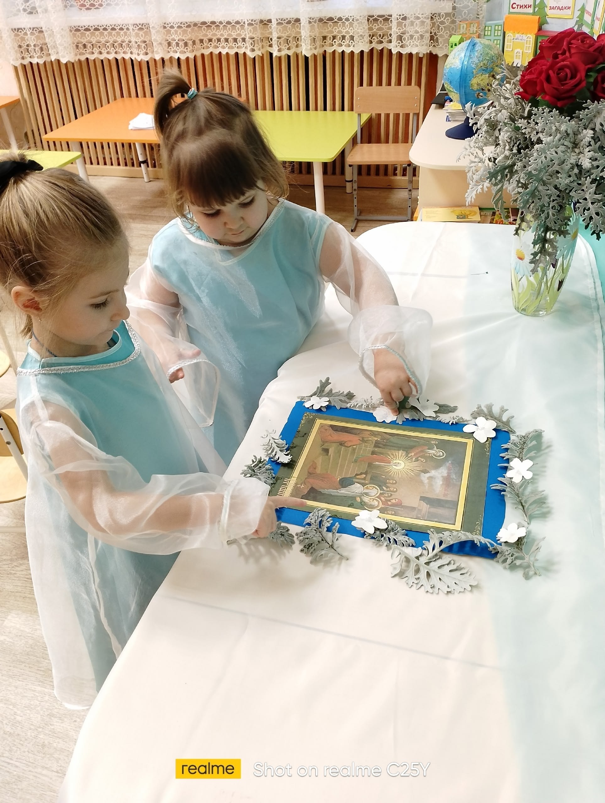 Занятие прошло очень увлеченно: дети рассмотрели икону, девочки украсили икону лепестками цветов, прочитали стихотворения о Богородице со свечами в руках, методом аппликации изобразили вазу с белыми цветами для праздника , пообещали быть послушными, чтить Богородицу , совершать добрые поступки.