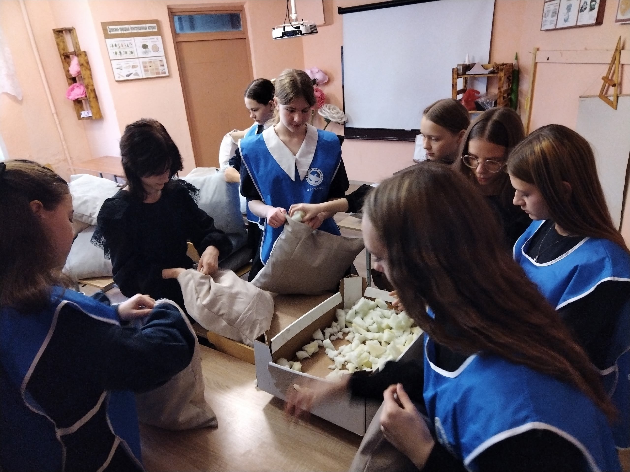 Волонтеры Победы Бобрышевской школы приняли участие в акции «Нити поддержки» и провели мастер-класс по пошиву подушек для полевых госпиталей СВО