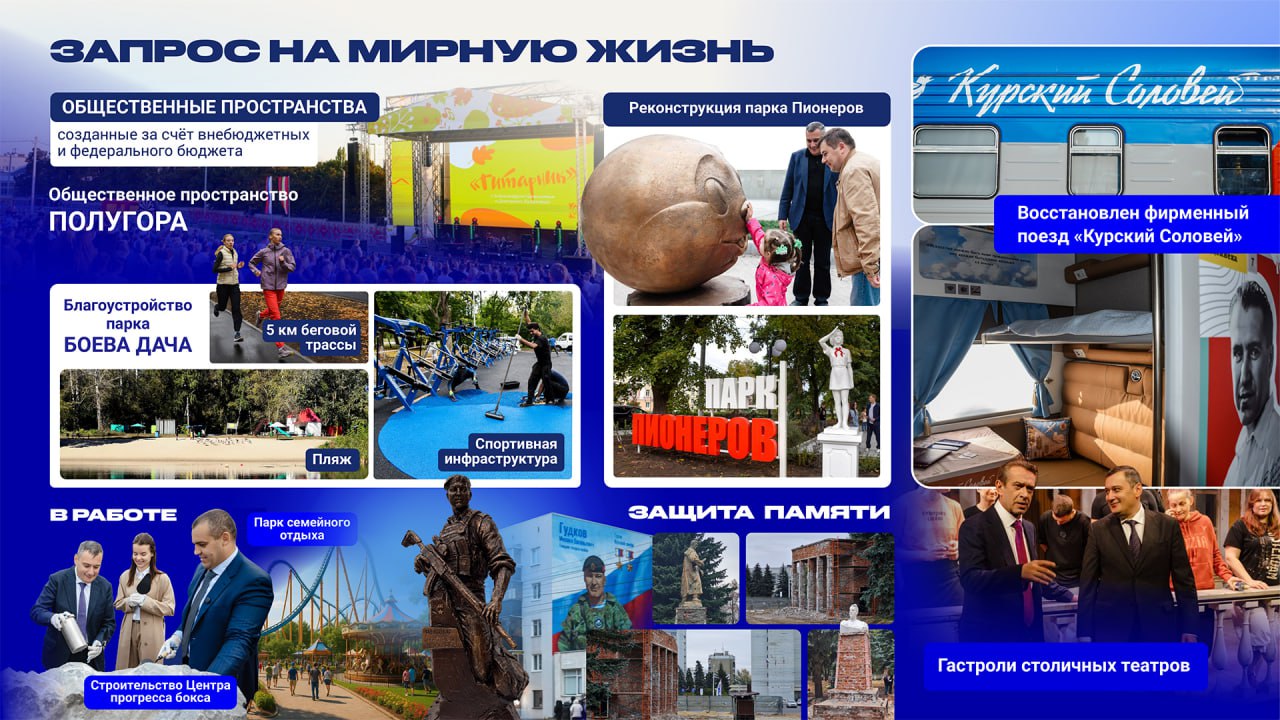 Глава региона Александр Хинштейн рассказал о благоустройстве, сохранении памяти, возрождении фирменного поезда «Курский Соловей», гастролях столичных театров, ремонте дорог и других проектах этого года. Подробности можно найти в карточке. #губернатор46
