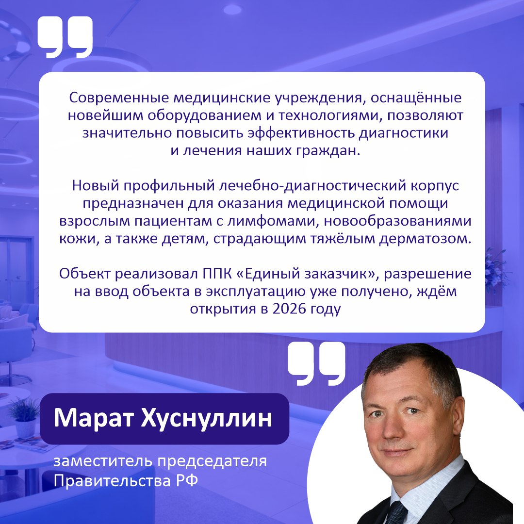 Возведение объекта проводилось в рамках госпрограммы «Строительство», куратором которой является Минстрой России. По словам заместителя председателя Правительства РФ Марата Хуснуллина, профильный корпус значительно расширяет возможности для оказания специализированной и высокотехнологичной медицинской помощи и напрямую способствует сохранению здоровья людей.