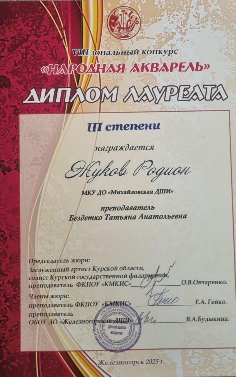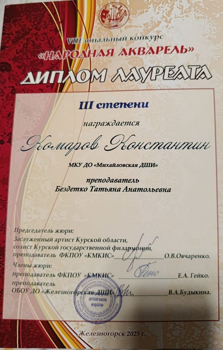 Поздравляем Жукова Родиона и Комарова Константина с Дипломом Лауреата III степени в VIII зональном конкурсе "Народная акварель", который проходил 13 декабря в ОБОУ ДО "Железногорская ДШИ".