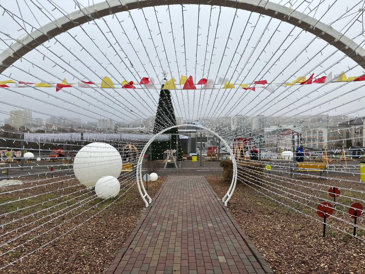 Уже установили новогоднюю ель, а также перевезли из Красного леса несколько световых объектов — шар, куб и светящуюся арку. Над центральной частью площадки монтируют навесы из гирлянд. Кроме того, пункт буккроссинга переместили ближе ко входу, чтобы он был удобнее для посетителей.