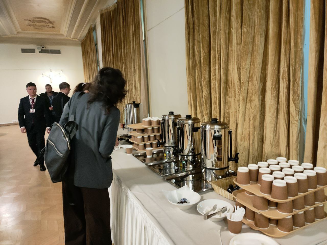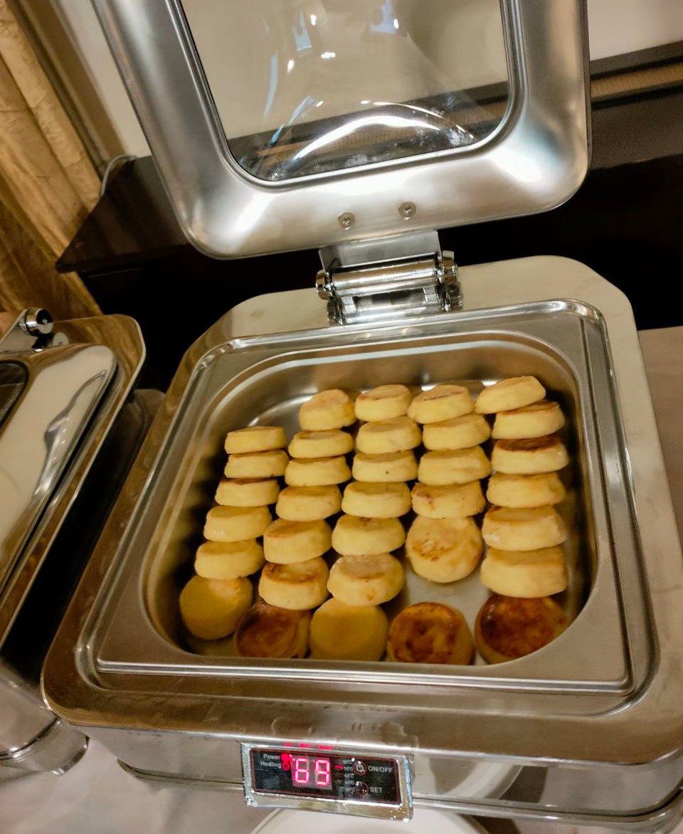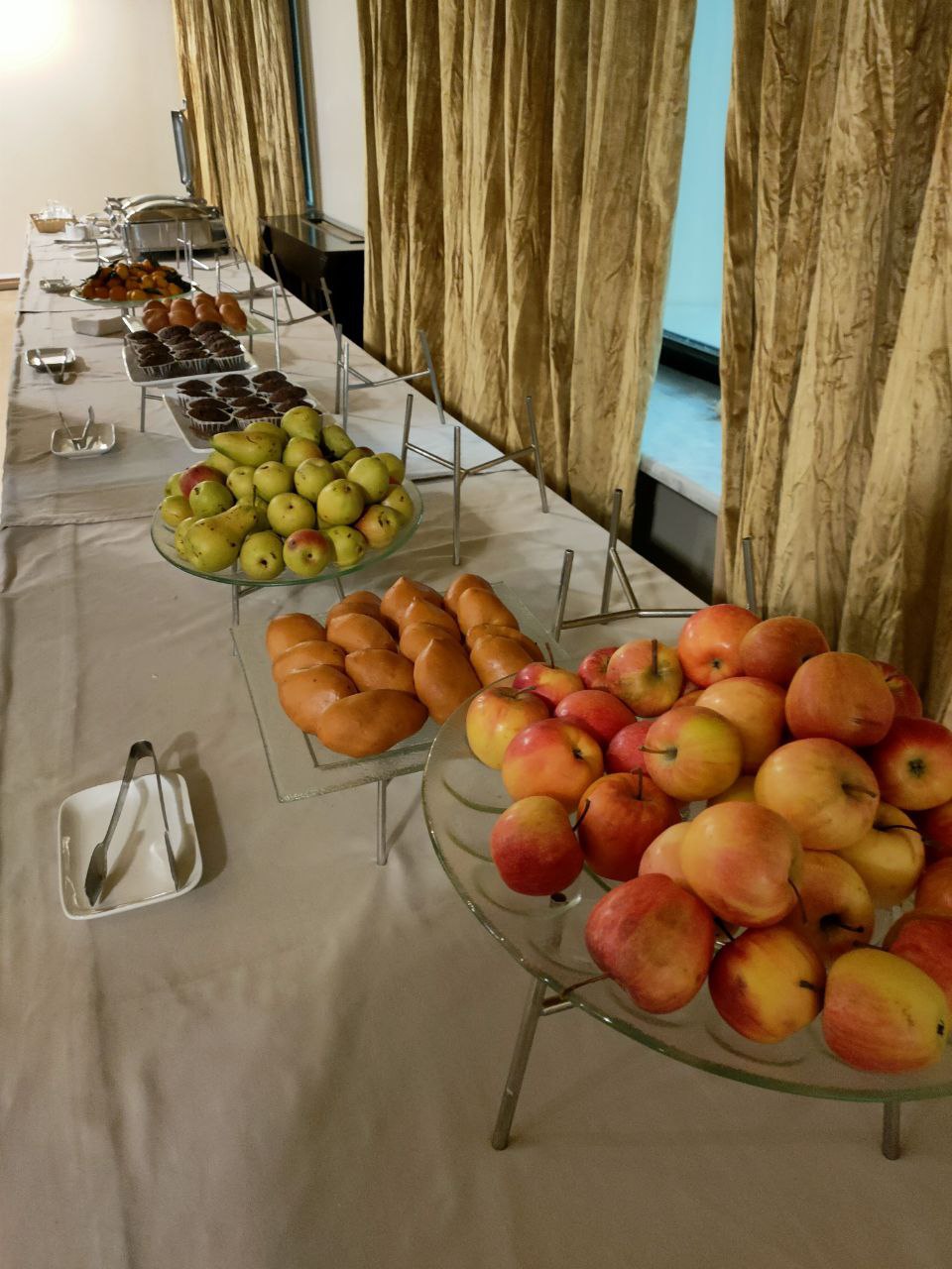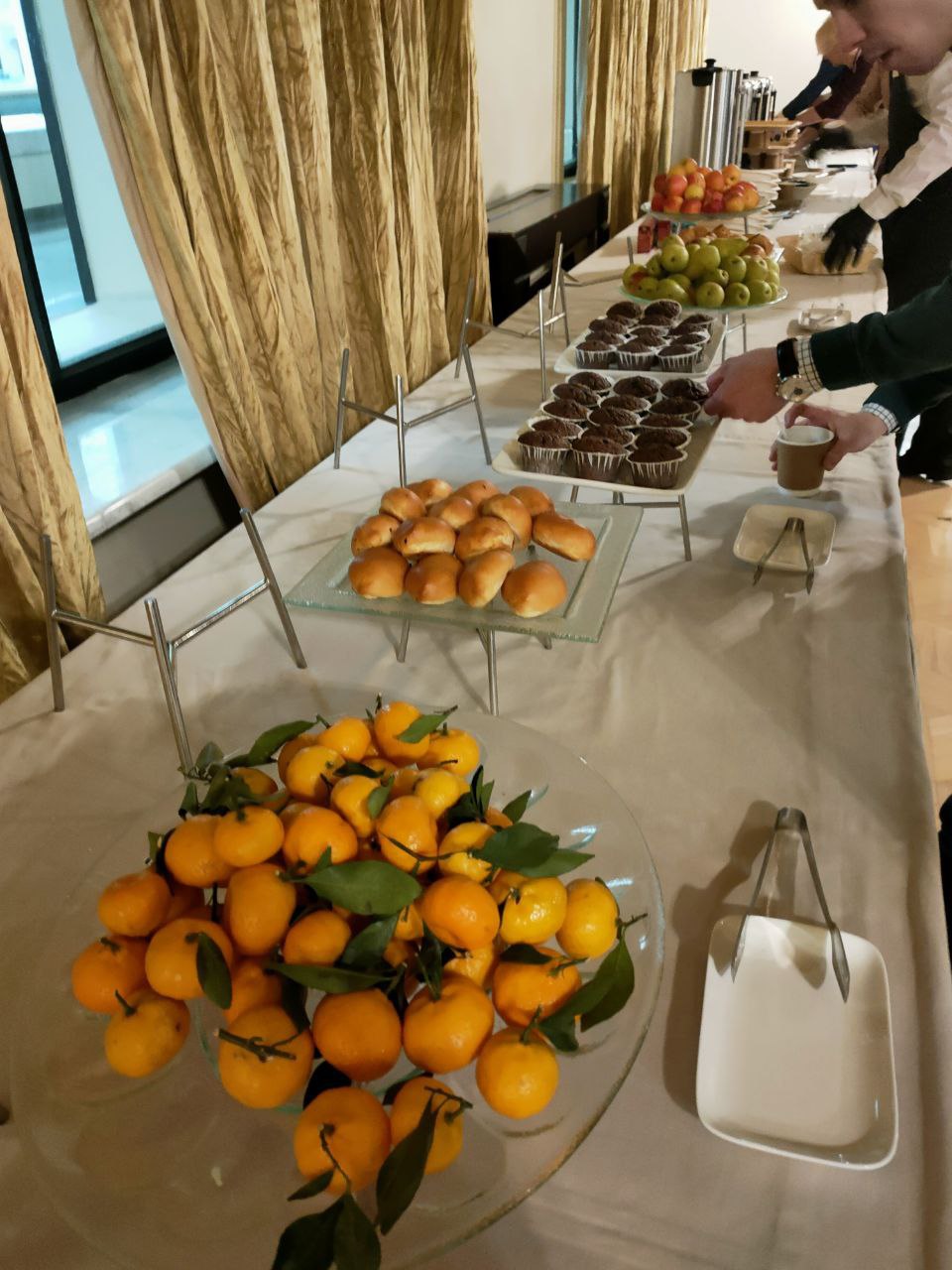 Перед пресс-конференцией журналистов напоили чаем и угостили сырниками, блинчиками с мясом, пирожками с капустой и фруктами
