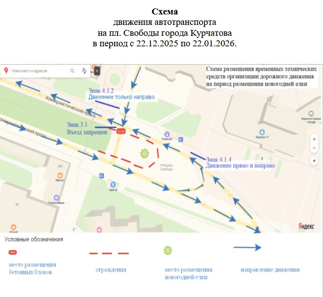 В целях обеспечения безопасности нахождения жителей города на территории размещения новогодней елки, в период с 22 декабря 2025 года по 22 января 2026 года будет изменено направление движения автотранспорта на пл.Свободы, согласно схеме. Распоряжение об этом подписано в администрации города Курчатова 19 декабря 2025г. №402-р.