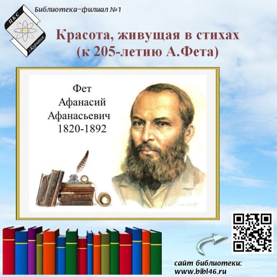 17 декабря 2025 года в читальном зале Библиотеки-филиала №1 библиотекарь Ю. Соболева провела обзор у книжной выставки «Красота, живущая в стихах»( к 205-летию А.Фета). Читателям были представлены сборники стихов А.А. Фета разных лет.