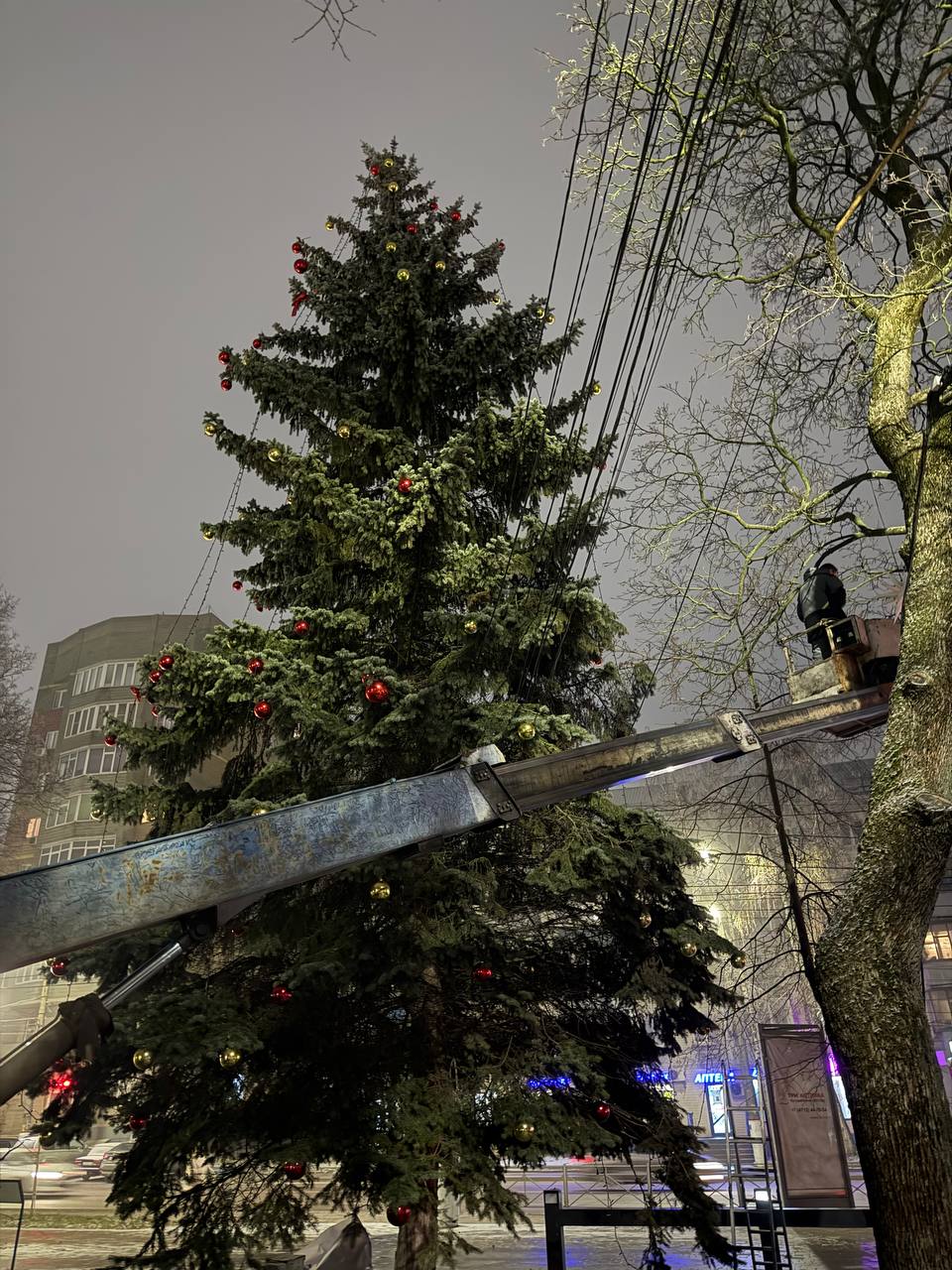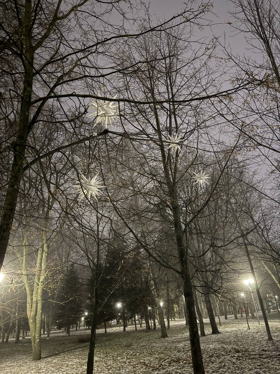 И вот в эти выходные парк Бородино действительно начали украшать. На елке появились игрушки, а на деревьях развесили светящиеся звезды.