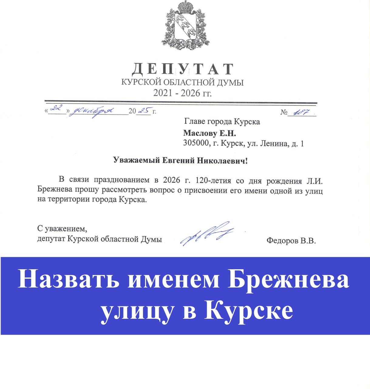Парламентарий пояснил, что считает инициативу логичной с учетом предстоящего в 2026 году 120-летия со дня рождения многолетнего руководителя страны. По словам депутата, судьба Леонида Ильича Брежнева, как он отмечает, связана с Курской областью, поэтому увековечение его имени в городской топонимике может быть уместным.