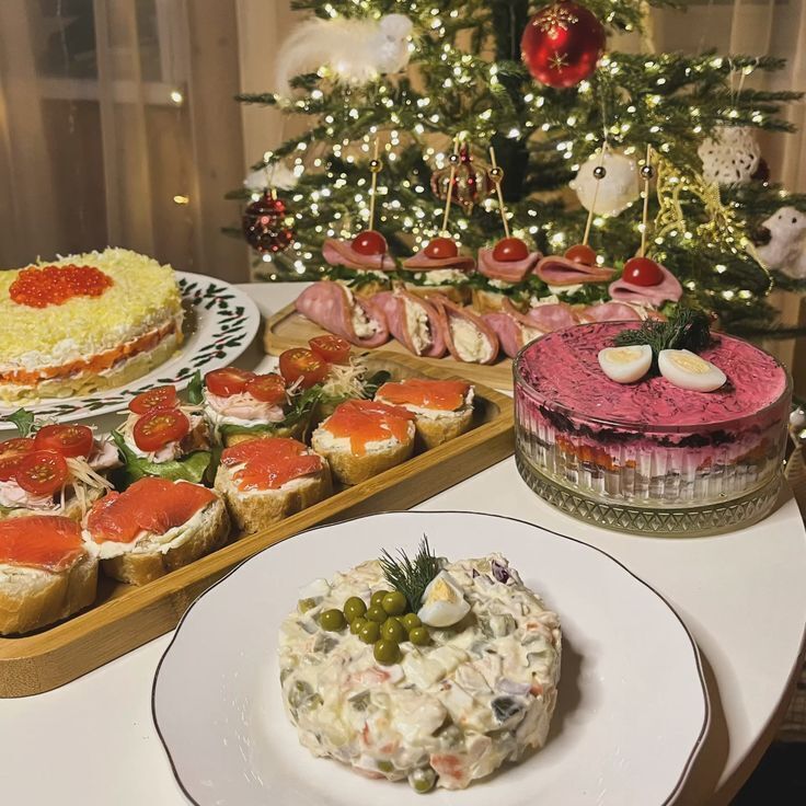 Салаты. Подойдут облегчённые версии традиционных салатов («Оливье», «Мимоза», «Сельдь под шубой», винегрет), зелёные овощные салаты, «Цезарь».