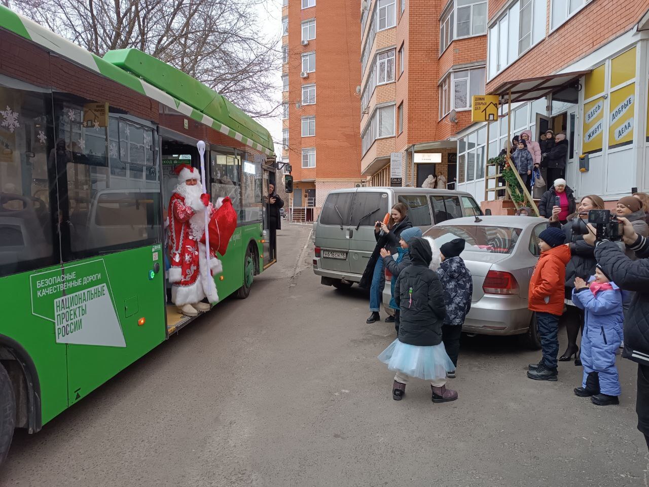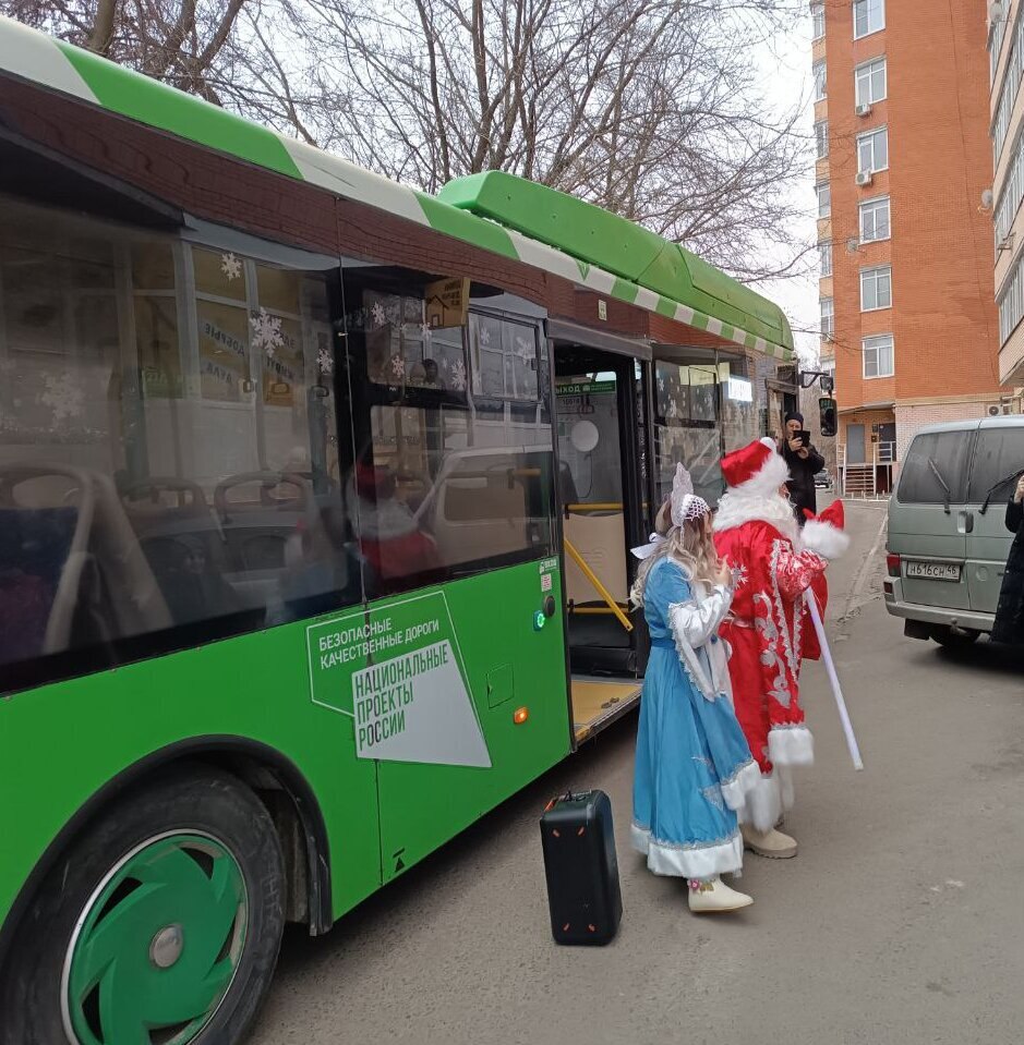 Украшенный зеленый «Волгабас» Национальной транспортной ассоциации сегодня отправился в необычный рейс по маршруту "Автобусный парк – "Домик добрых дел". И привез с собой транспортных Деда Мороза и Снегурочку. Сказочные герои спешили поздравить с Новым Годом ребятишек из семей, оказавшихся в сложной жизненной ситуации. Эффектное появление главного зимнего волшебника – не на санях, а на современном автобусе - произвело настоящий фурор. Кстати, по такому случаю сотрудники парка тоже постарались: украсили салон разноцветными шарами, бусами и мишурой.