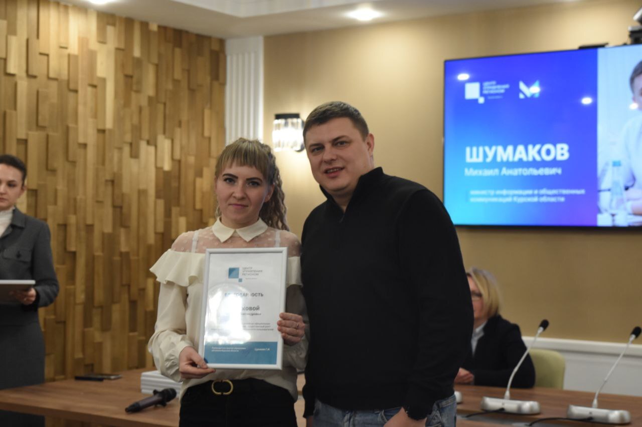 За высокие результаты в развитии официальных страниц в социальных сетях, существенный рост аудитории и повышение вовлеченности пользователей Благодарностью Центра Управления Регионом Курской области отмечена аналитик - Худякова Татьяна Александровна.