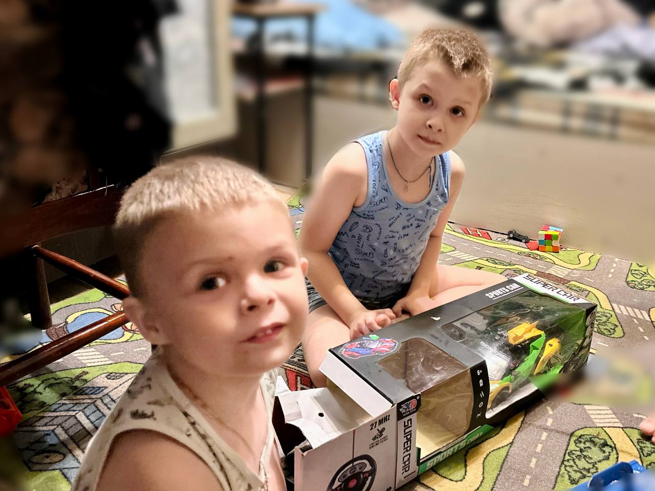 Братьям подарили машинки на радиоуправлении, а также сладкие гостинцы.