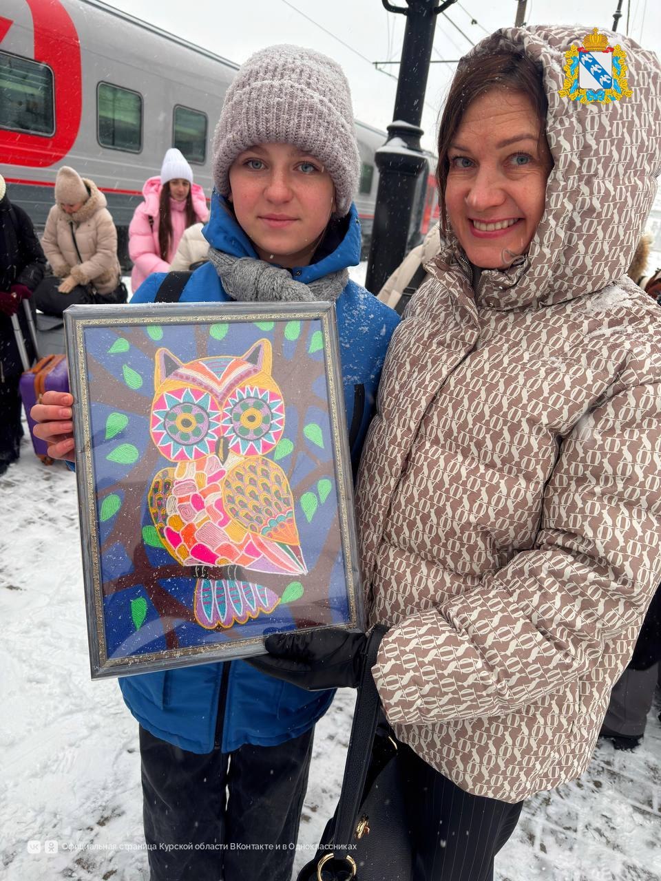 На вокзале ребят встретила заместитель Губернатора Курской области – руководитель Представительства Курской области при Правительстве Российской Федерации Галина Авдонина. Во время встречи юная рукодельница Ксения Потупикова из Дмитриевского района подарила Галине Геннадьевне картину, выполненную в технике ниткографии.