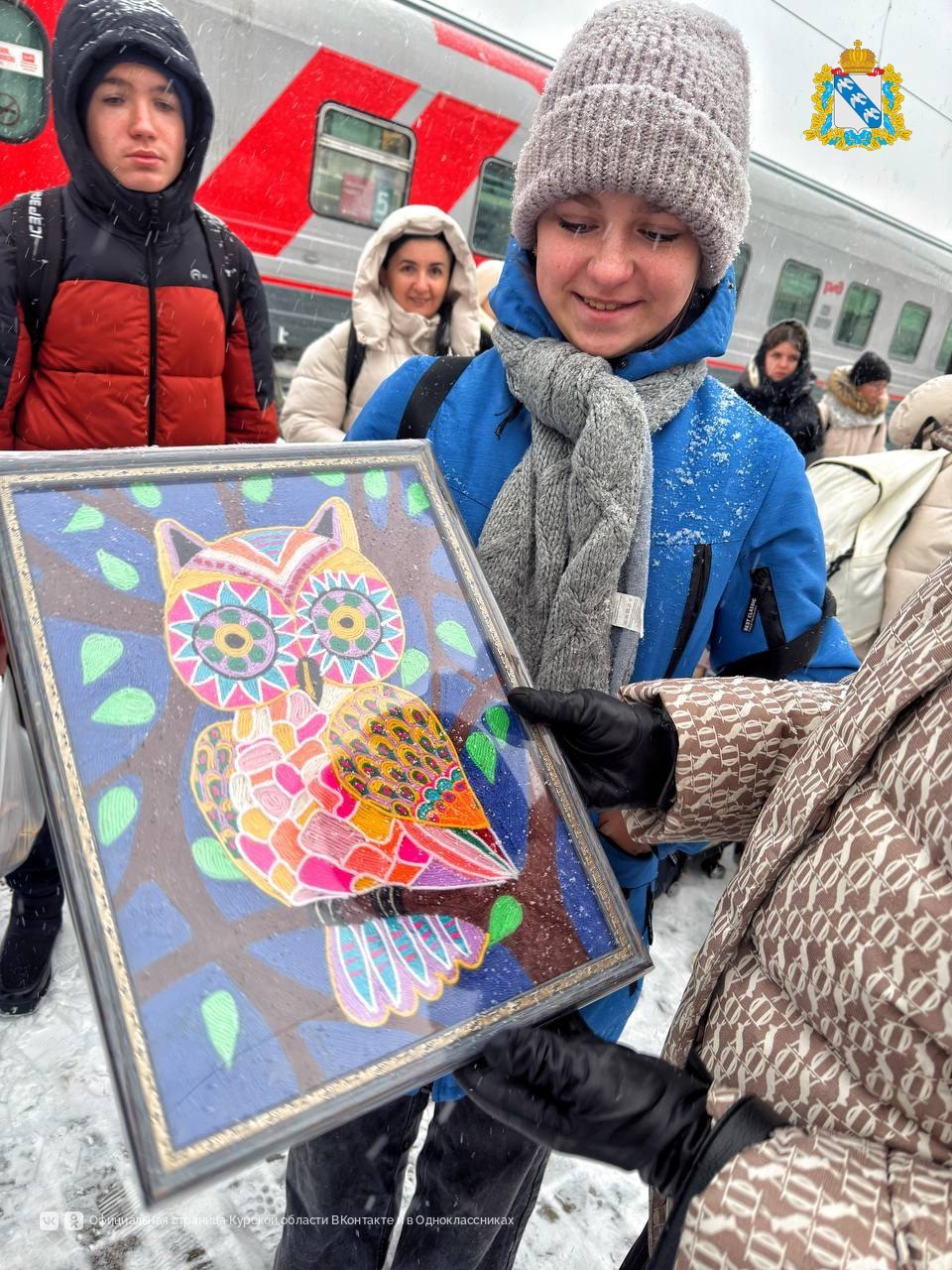 Делегацию на вокзале встретила заместитель губернатора Курской области Галина Авдонина. Участники подготовили для неё творческий подарок — картину, выполненную в технике ниткографии.