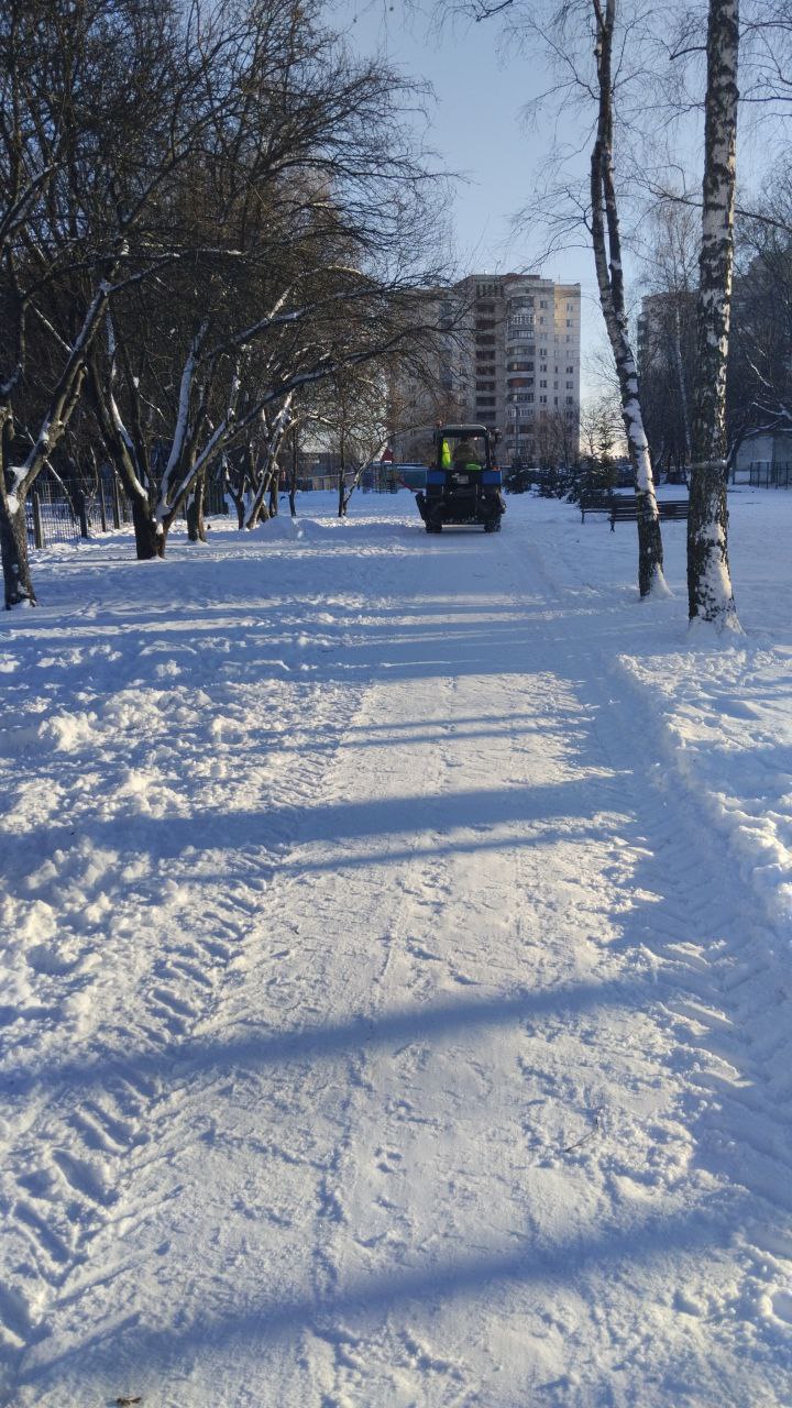 Подрядчик расчищает пешеходные зоны от снега, чтобы горожане могли гулять с комфортом.