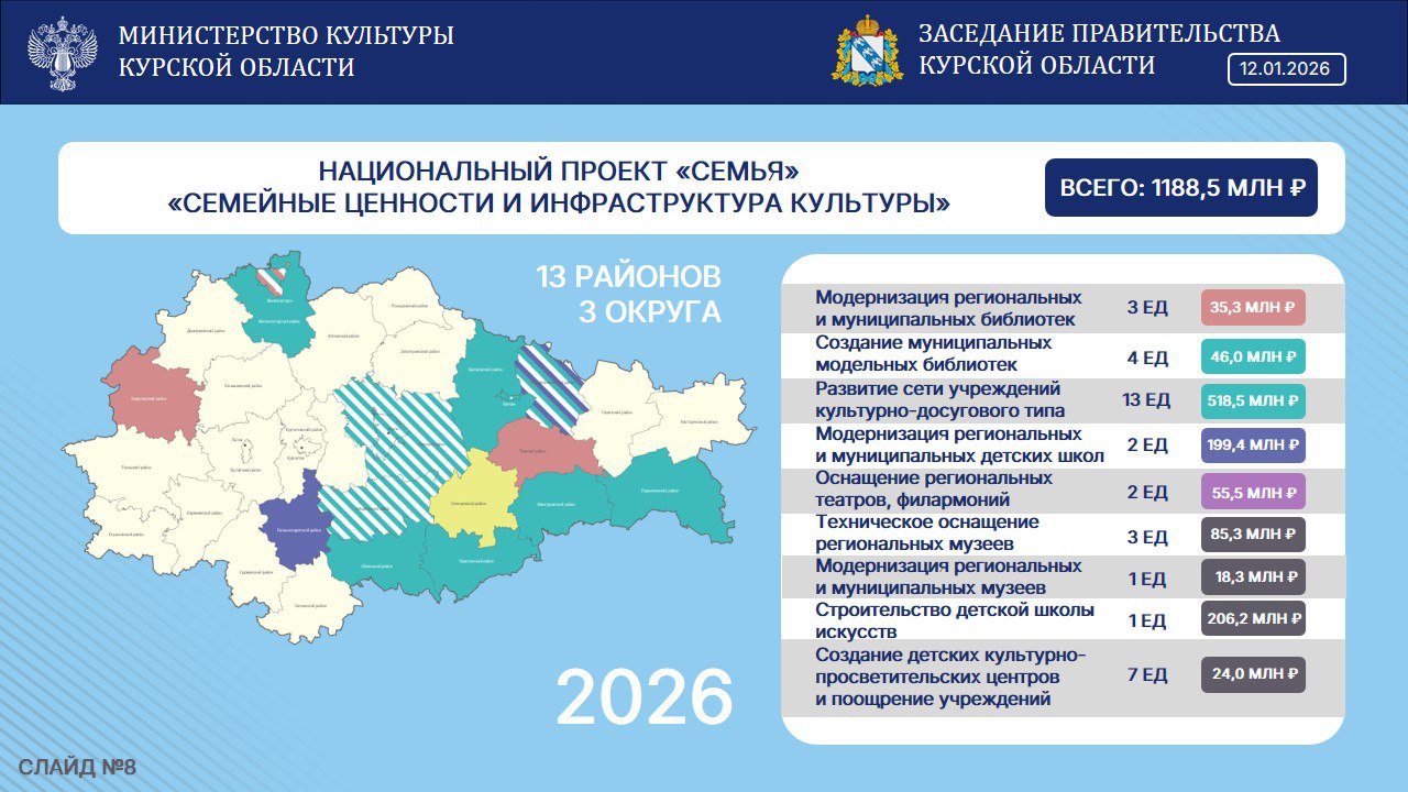 Всего же Курской области по федеральному проекту «Семейные ценности и инфраструктура культуры» нацпроекта «Семья» из федерального бюджета будет выделен 1 млрд 188,5 млн рублей.
