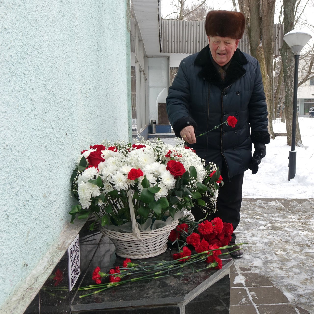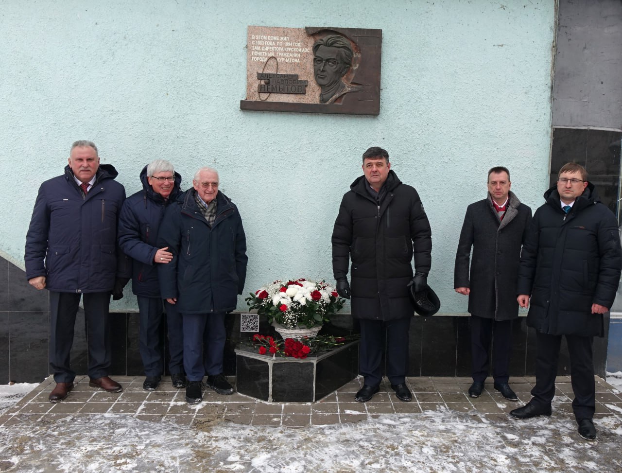 Затем возложили цветы к мемориальной доске на доме, где жил Почетный гражданин города Курчатова Александр Павлович Немытов - заместитель директора по капитальному строительству Курской АЭС, которому 12 января исполнилось бы 97 лет.
