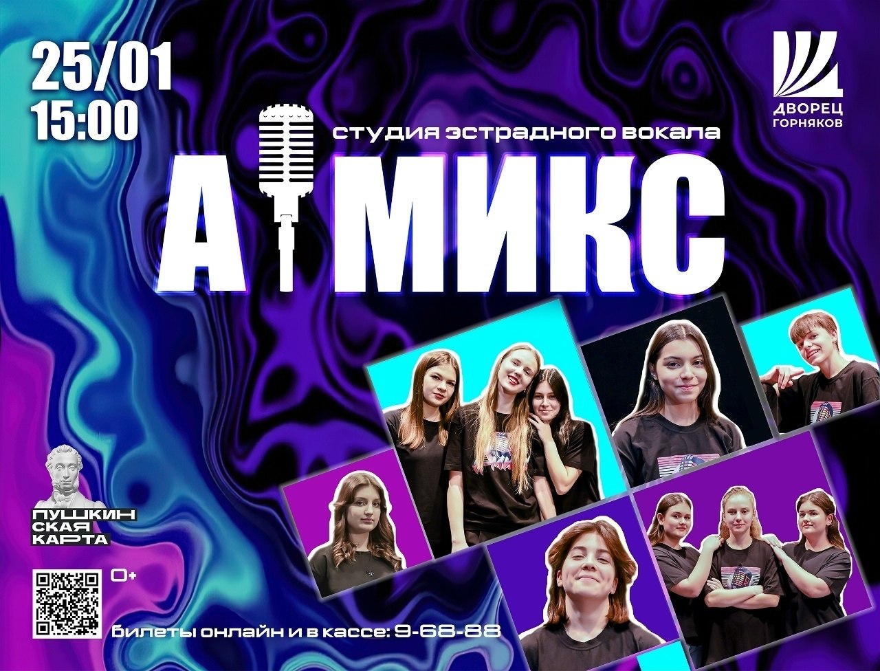 Уважаемые ценители музыки! Образцовый коллектив Студия эстрадного вокала «А-Микс» приглашает вас на большой сольный концерт, который пройдёт 25 января в 15:00.