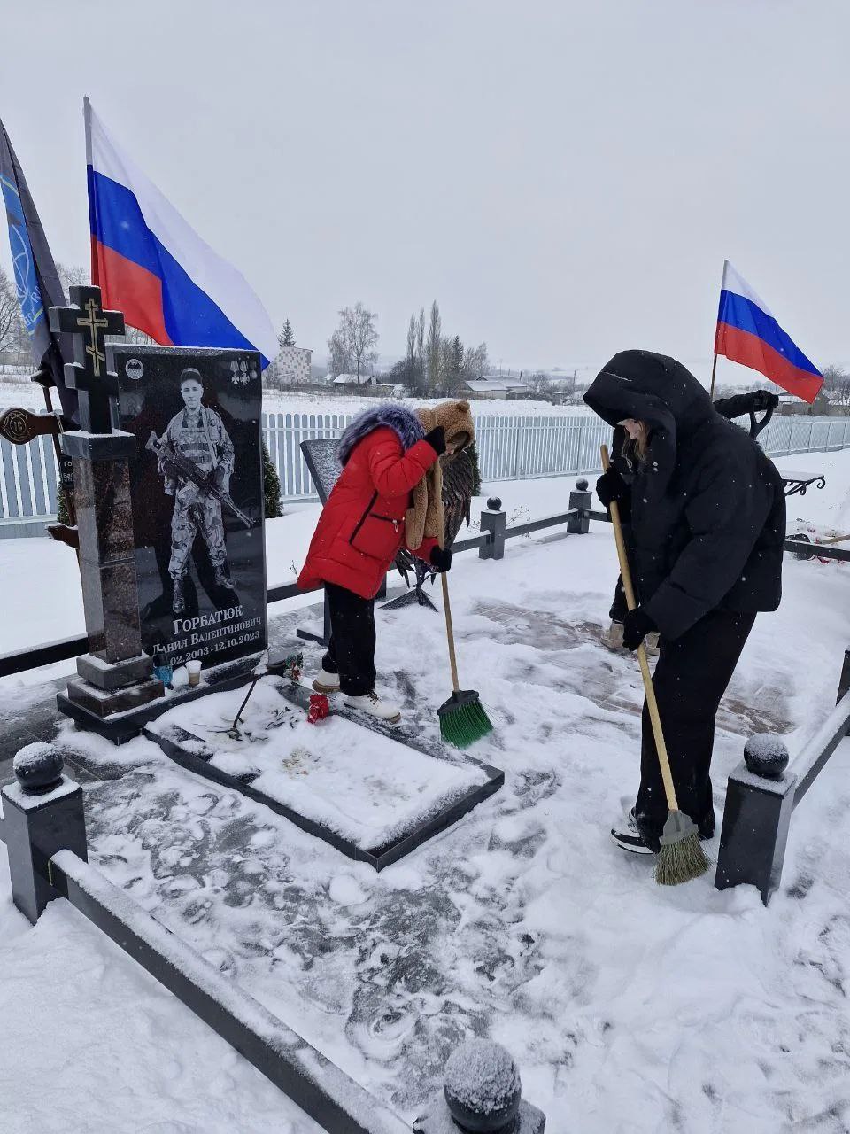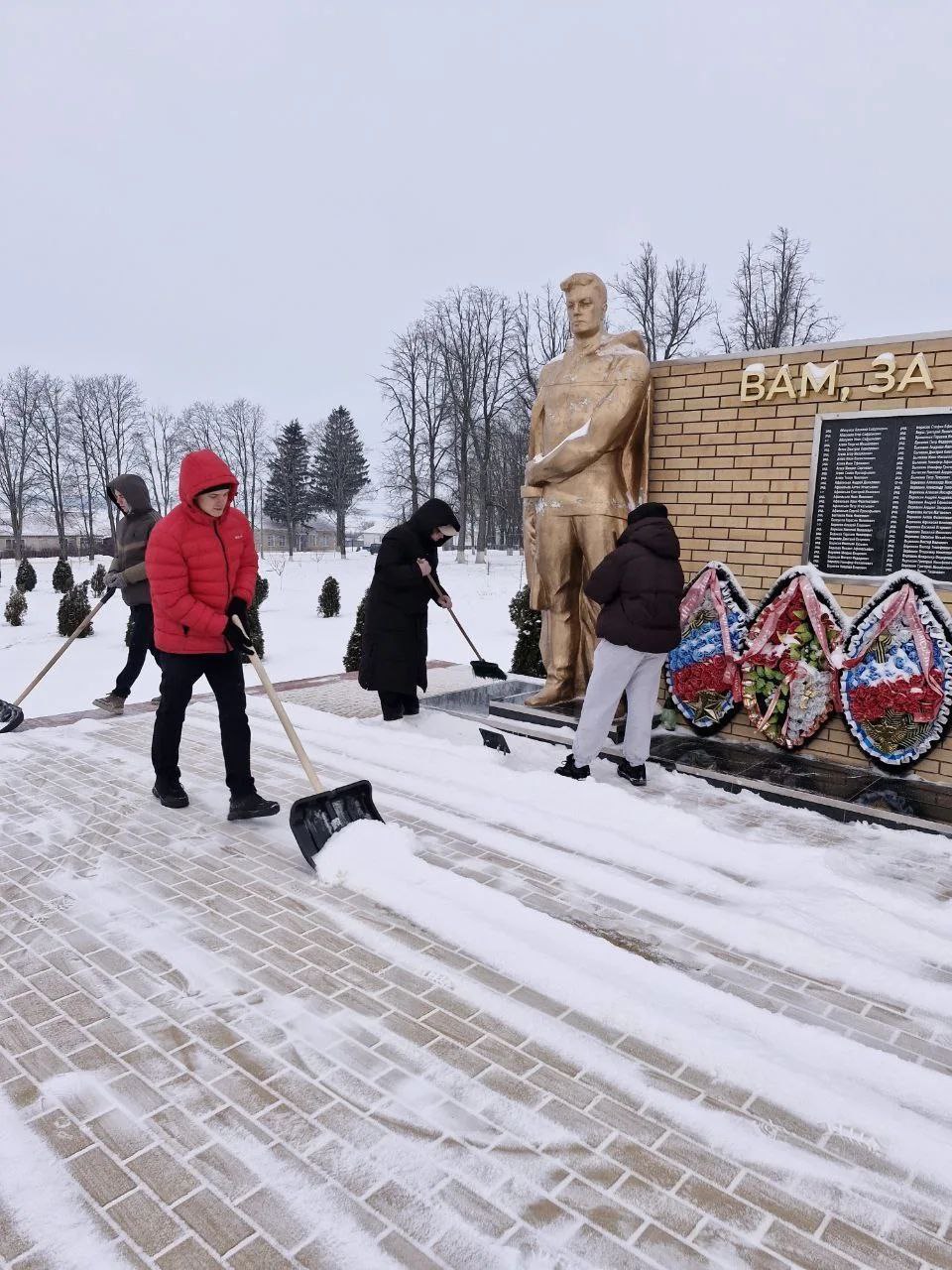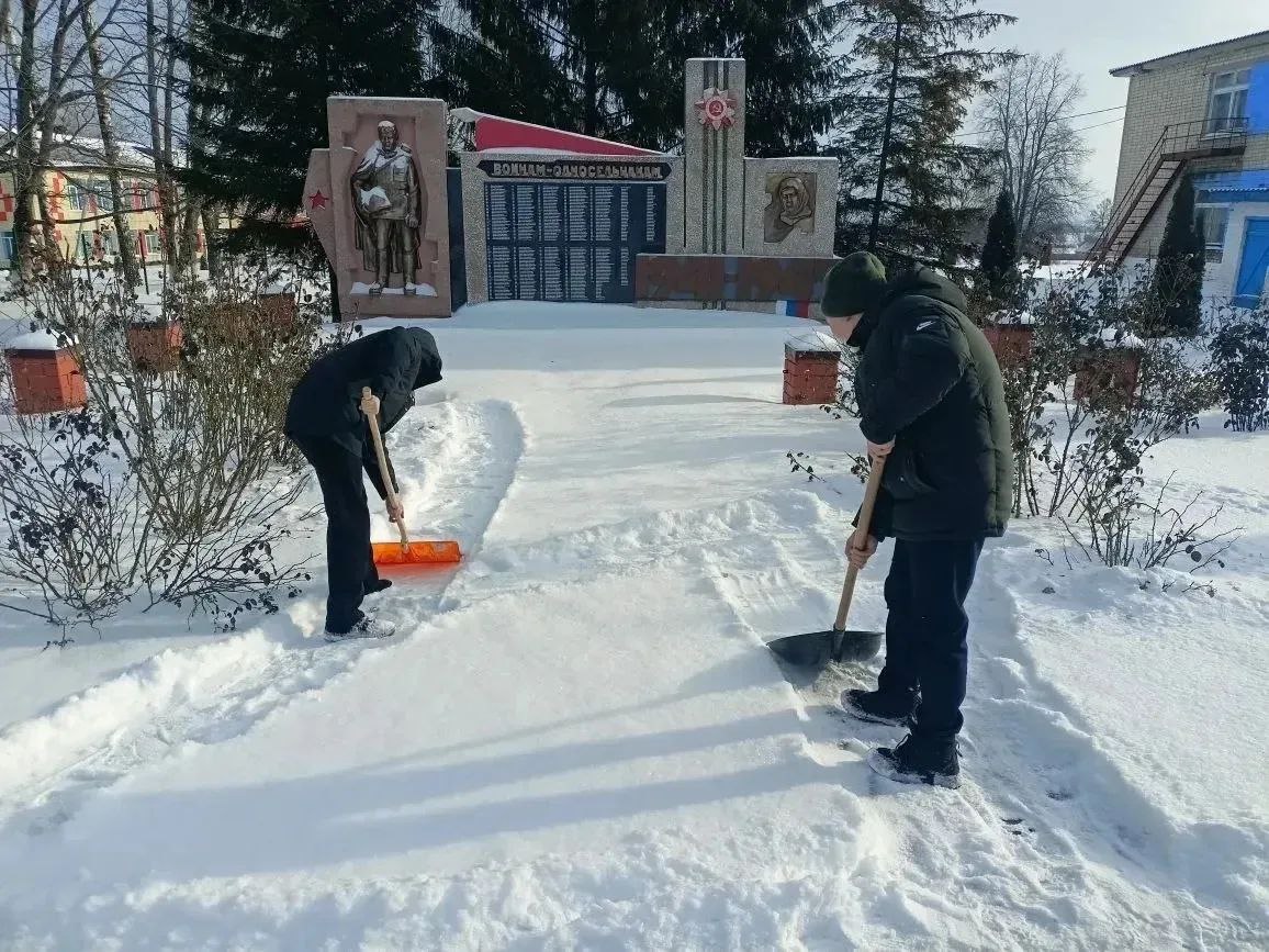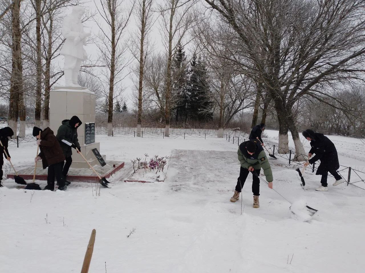 В первые учебные дни после каникул школьники района очищают от снега памятники и мемориала на территории населенных пунктов Медвенского района
