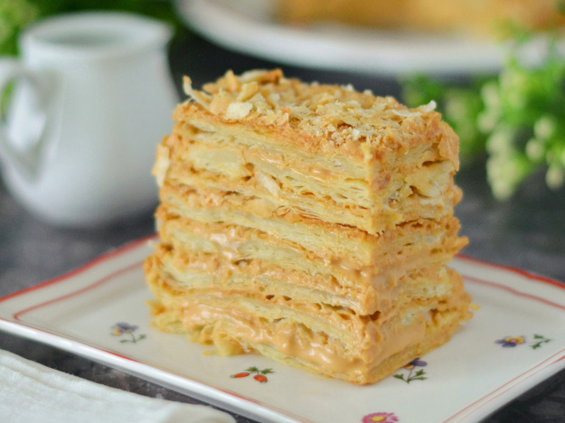 - Торт «Наполеон» с вареной сгущенкой — коржи из готового слоеного теста, которые просто тают во рту, в сочетании с нежным кремом на основе сгущенного молока.