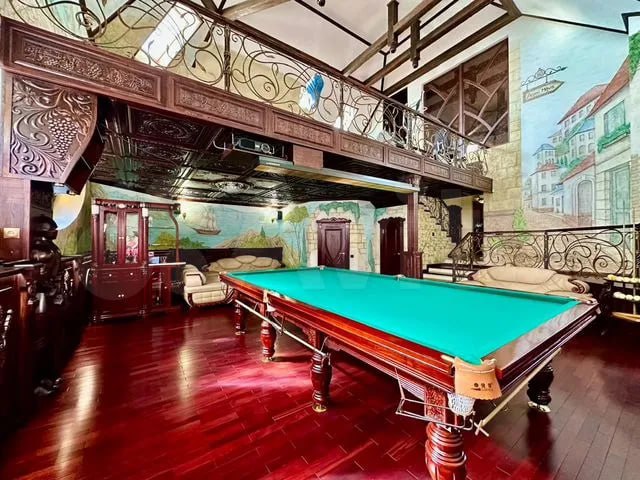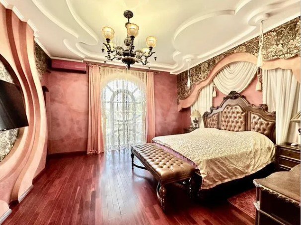 По описанию, объект отличается дизайнерской отделкой с применением дорогих материалов: полы из гранита и тика, окна из красного дерева, лестницы и двери из малазийского красного дерева, витражи и барельефы ручной работы. В гостиной и бильярдной заявлена высота потолков до 10 метров. В доме пять спален, кабинет, домашний кинотеатр, инфракрасная сауна, спортивный зал и лифт-подъемник.