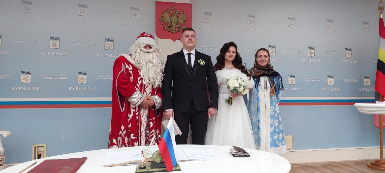 Первую пару, зарегистрировавшую брак в отделе ЗАГС администрации города Курчатова в этом году, Дмитрия и Марию пришли поздравить команда АНО "Поколение уверенного будущего" и волонтерское движение "Вторая жизнь" в роли Деда Мороза и Снегурочки (руководитель движения Мария Карпенко). Они встречали и провожали новобрачных. Это было приятной неожиданностью для молодожёнов. Добрые и искренние пожелания с рождением семьи принимали Дмитрий и Мария. Теперь в свадебном альбоме новобрачных будут не просто свадебные фотографии, а необычные - с Дедом Морозом и Снегурочкой.