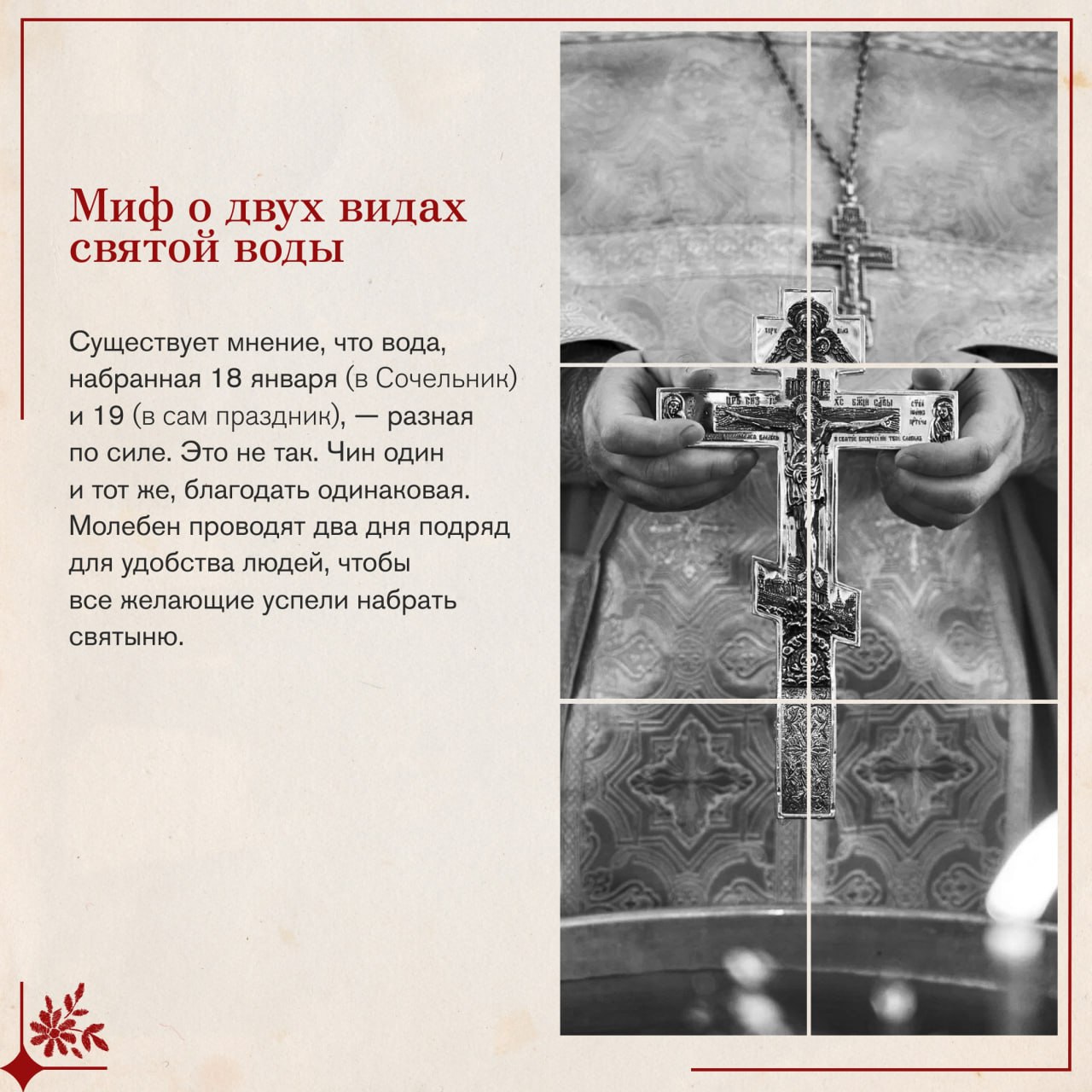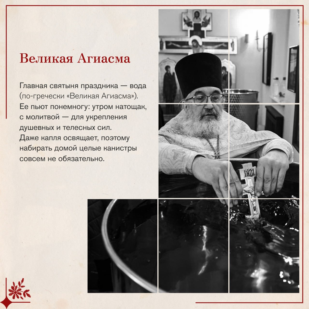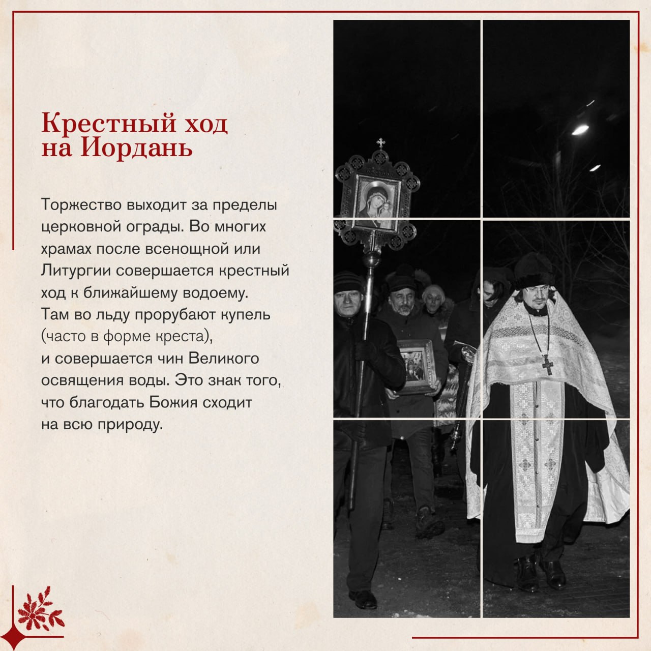 В этот день вспоминают, как пророк Иоанн крестил народ в Иордане в знак покаяния. Христос тоже вошел в воду, хотя был безгрешен. Он сделал это не чтобы очиститься Самому, а чтобы Своим погружением освятить водную стихию и всю материю мира.