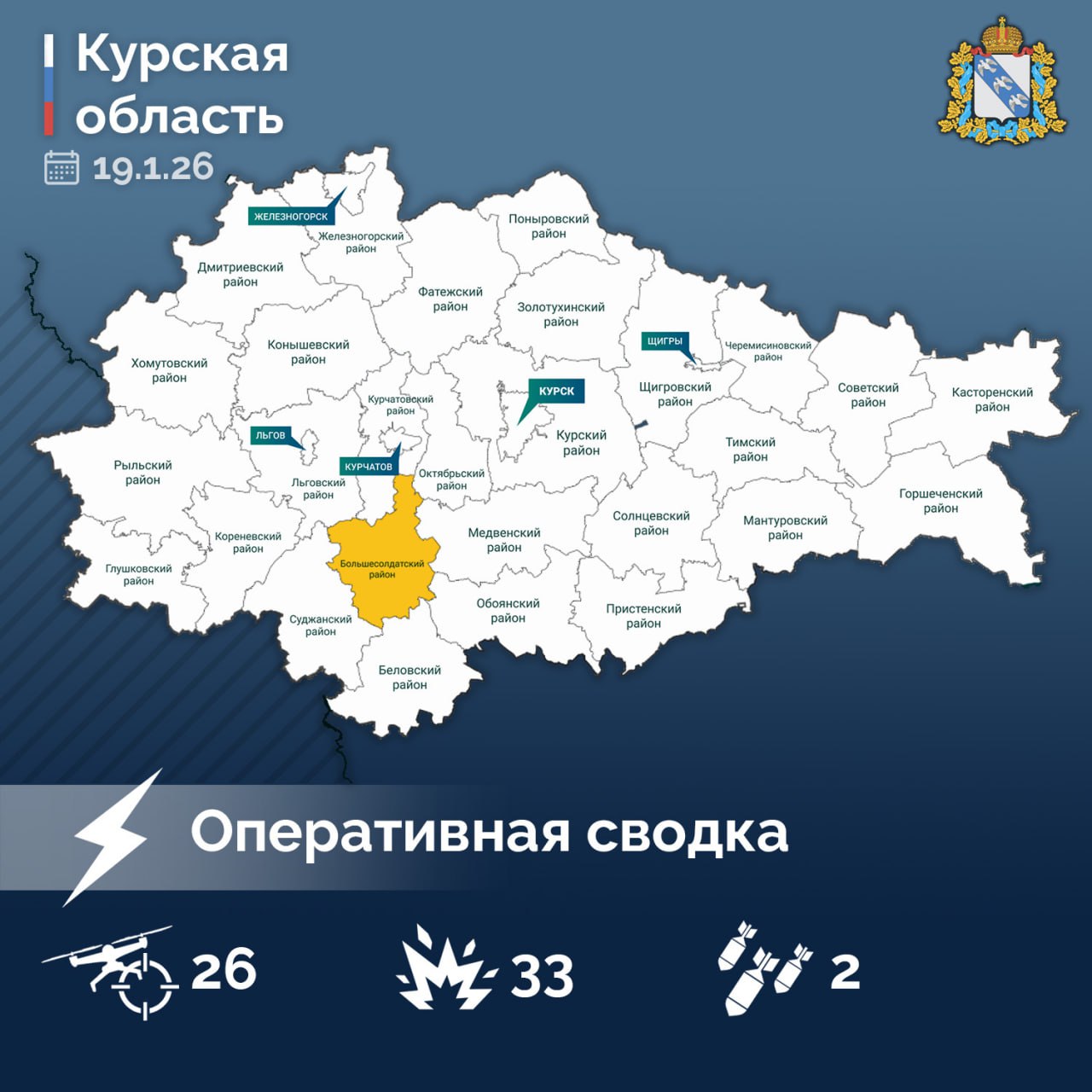 «Всего в период с 9:00 часов 18 января до 7:00 часов 19 января сбито 26 вражеских беспилотников различных типов. 33 раза враг применял артиллерию по отселённым районам. 2 раза беспилотники атаковали нашу территорию с помощью сброса взрывных устройств.