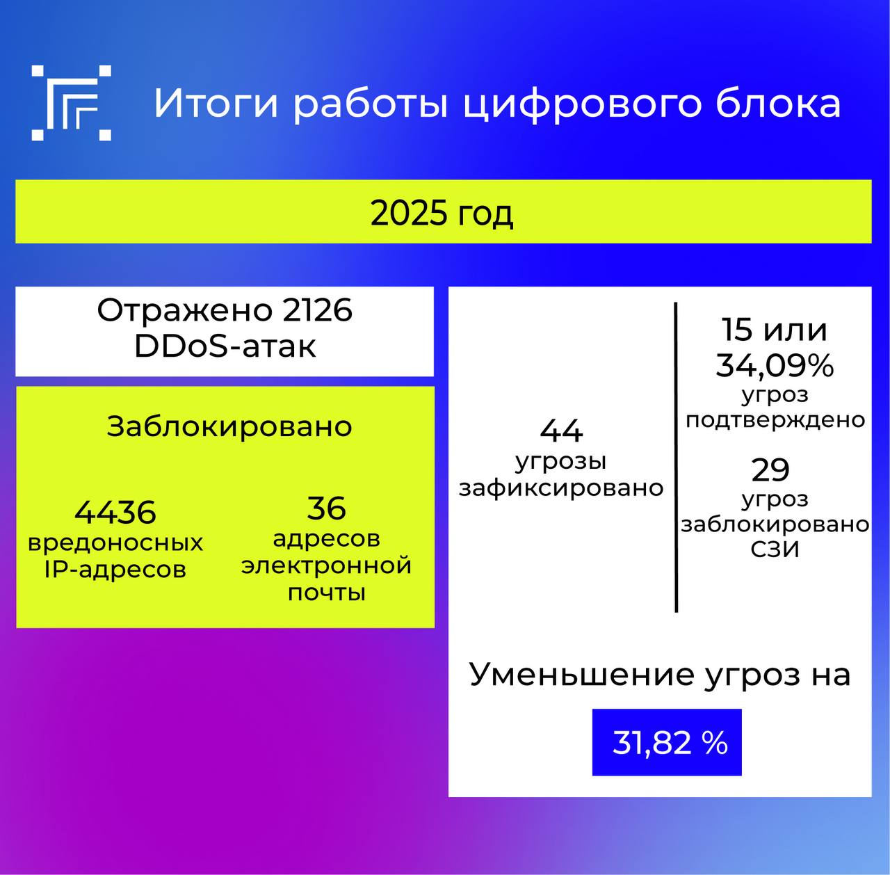 Также в 2025 году на инфраструктуры органов власти было зафиксировано 44 угрозы, о которых информировал национальный координационный центр по компьютерным инцидентами, и благодаря выстроенной защите, только 15 угроз было подтверждено и потребовало проведения расследований с дальнейшим устранением, что составило 34,09% от их общего количества.