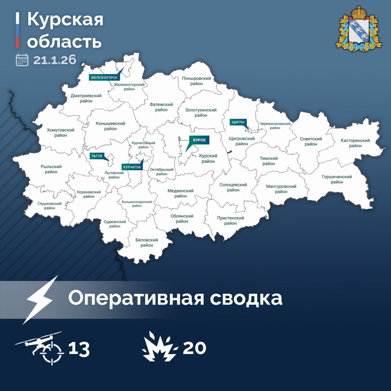 «Всего в период с 9:00 часов 20 января до 7:00 часов 21 января сбито 13 вражеских беспилотников различных типов. 20 раз ВСУ применили артиллерию по отселённым районам.